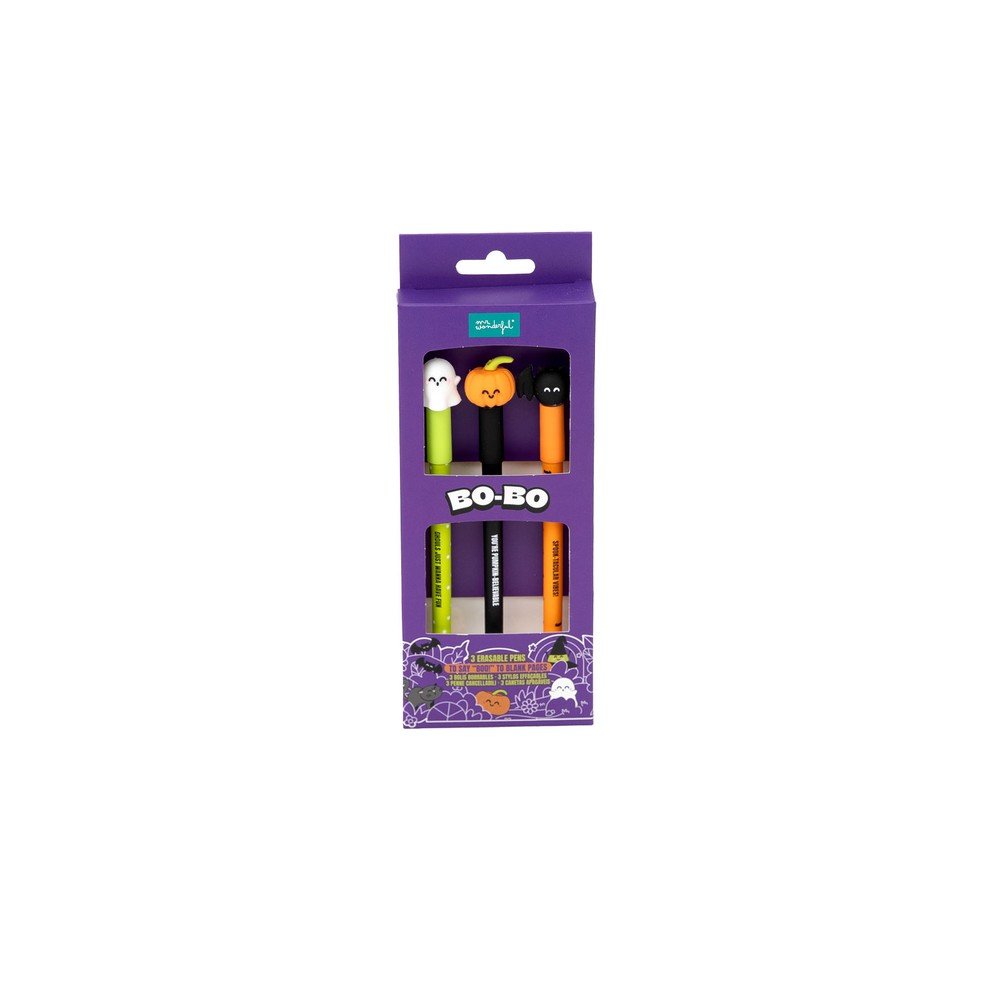 Set de 3 bolis borrables Bo-Bo, con mensajes y personajes relacionados con la festividad de Halloween. Mensajes de los bolígrafos:_x000D_ Fantasma: Ghouls just wanna have fun / Calabaza: You?re pumpkin-believable / Murciélago: Spook-tacular vibes!_x000D_ El cuerpo del bolígrafo tiene un tacto muy suave e incluye una goma de borrar en el extremo opuesto al del personaje que permite borrar de forma rápida y sencilla lo ya escrito. _x000D_ Importante: la tinta del bolígrafo se borra solamente con esa goma, no se borrará con ningún otro material._x000D_ Colores de las tintas: azul, rojo y negro.
