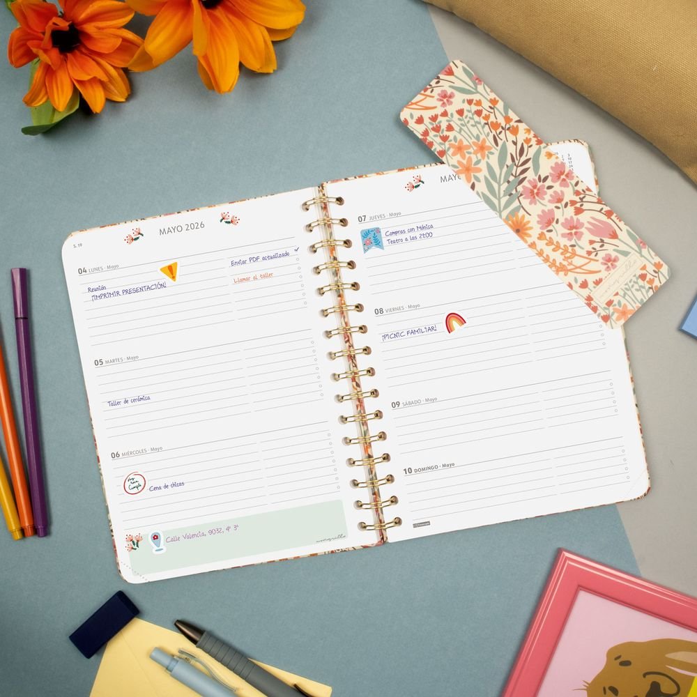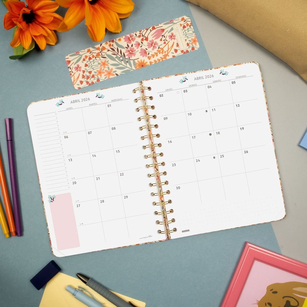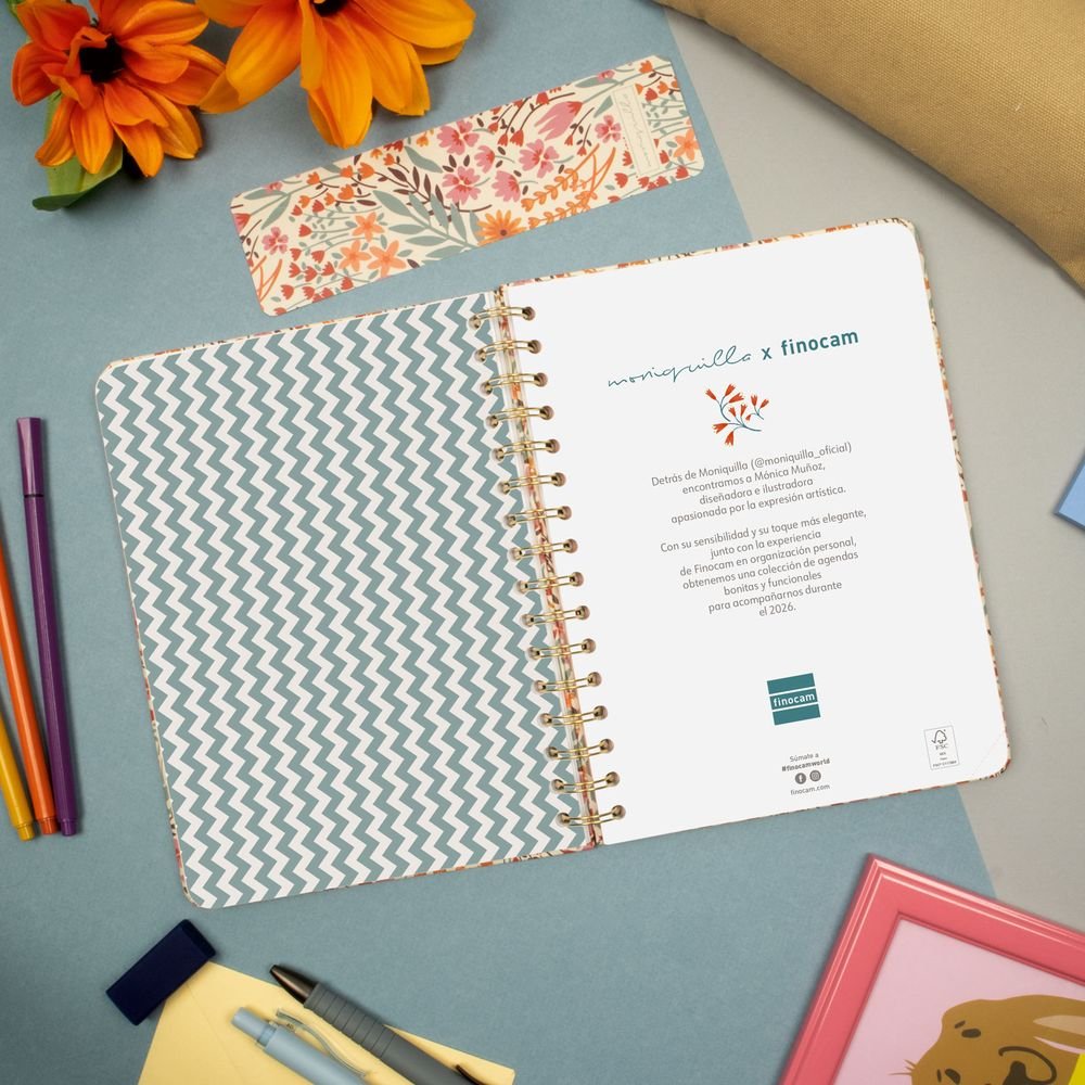 Agenda de tapa dura de cartón forrado con peliculado mate antirrayaduras. Con espiral doble, goma elástica y esquinas microperforadas para localizar rápidamente el día/semana en curso. Esta agenda se ha creado en colaboración con la diseñadora e ilustradora Moniquilla, obteniendo unas agendas bonitas y funcionales. Con una estética limpia y minimalista, contiene información de interés en la anualidad y otros contenidos extra. Además, dispone de dos marcapáginas y de adhesivos temáticos orientados a la organización personal. Formato similar a DIN A5; con las ventajas de una agenda portable y una de sobremesa. Duración: Enero 2026 Diciembre 2026 (12 meses). Interior: Semana Vista Horizontal. Visión de la semana completa en horizontal que permite la escritura natural. Con planificación mensual cuadriculada al inicio de cada mes. Con información de los festivos de España. La anualidad de la agenda incluye: festivos nacionales, cambios de estación y días señalados. Contiene planificación m