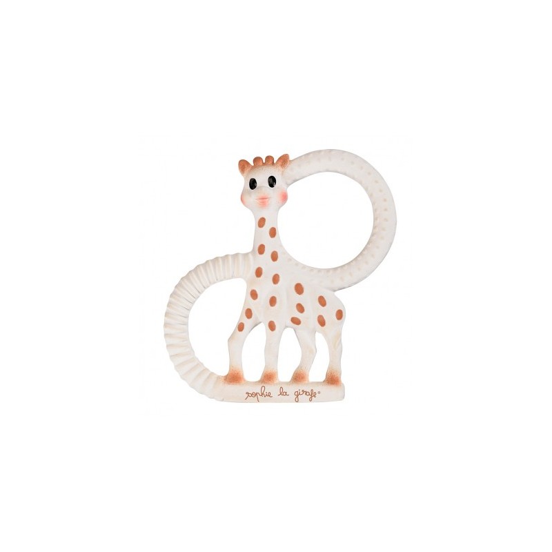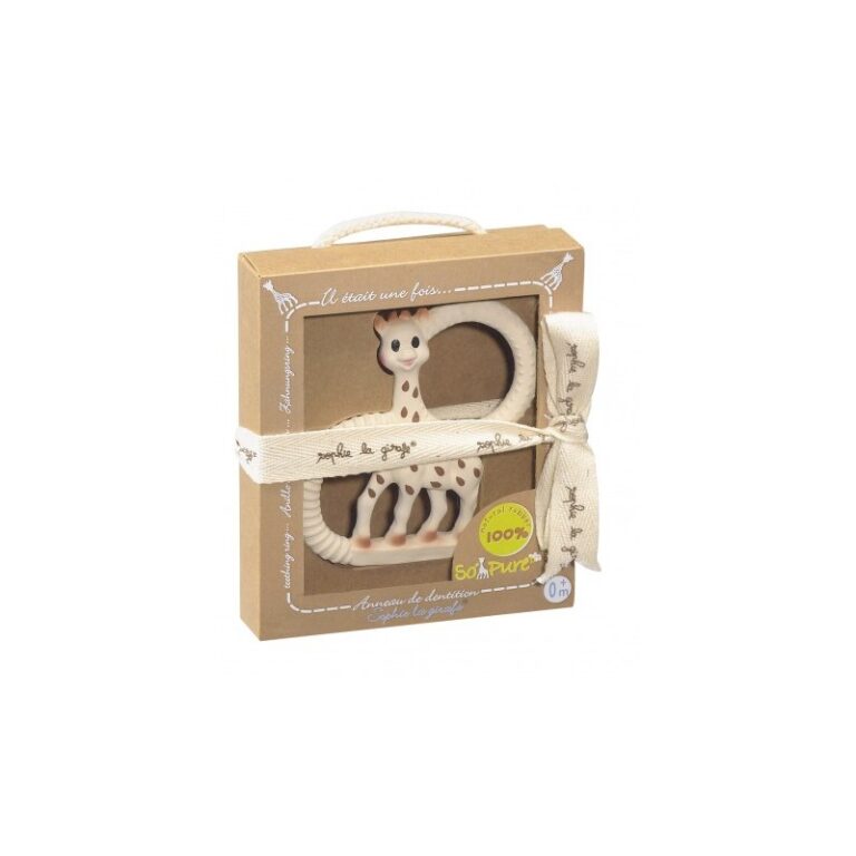 El anillo de dentición SO’PURE Sophie la girafe de Vulli está fabricado con caucho 100% natural y ha sido diseñado para acompañar al bebé desde el nacimiento, ayudando a aliviar las molestias de las encías durante los primeros empujes dentarios. Su versión extra blanda y flexible es especialmente agradable para los bebés cuando comienzan a salir los primeros dientes.