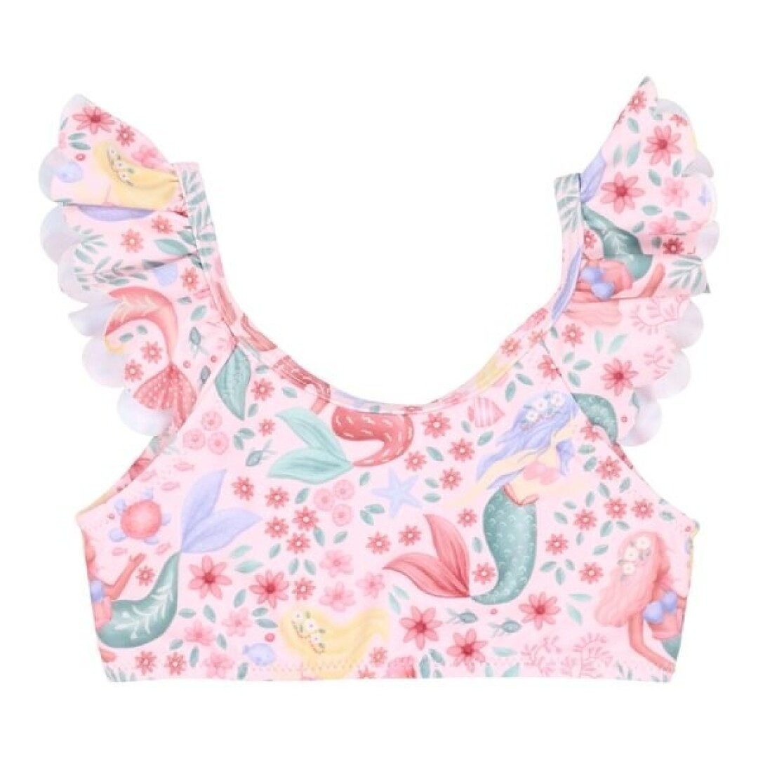 Bikini infantil con estampado de sirenas y volantes, cómodo y perfecto para playa y piscina.