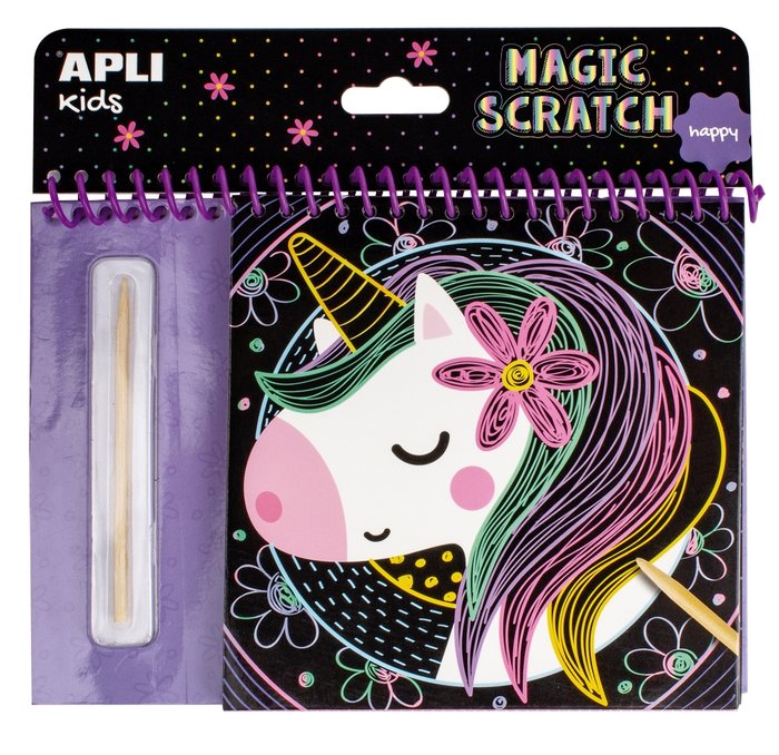 Bloc de láminas para rascar modelo Happy. Cada bloc contiene 8 láminas y un palito rascador de madera. Juego fácil y divertido: solo se deben rascar los dibujos de las láminas con el lápiz de madera y descubrir los colores ocultos que hay debajo. Cada ilustración incluye una imagen con un diseño de muestra, pero el niño puede dibujar marcando líneas y motivos diferentes. Juego ideal para poder llevarse de viaje. Juego con un alto valor didáctico: promueve la creatividad y ayuda a reforzar la confianza y la autoestima, ayuda a mejorar la precisión, la habilidad manual y la concentración. Recomendado para niños a partir de 3 años.