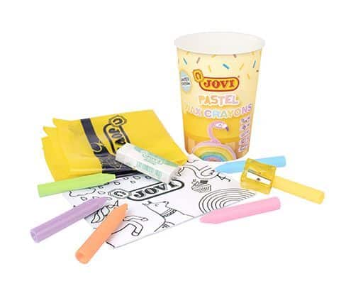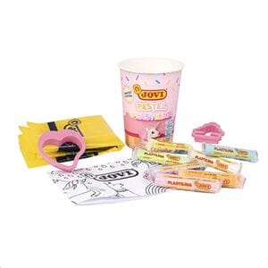 Contenido: -4 Botes con 7 barras de plastilina colores pastel, 2 moldes corazón, 1 guia con dibujos y un mantel de plástico. -4 Botes con 6 ceras colores pastel, 1 afilalápices, 1 goma de borrar, 1 guia y un matel de plástico. -4 Botes con 7 botes de pintura, 1 pincel,1 guia y un mantel de plástico.