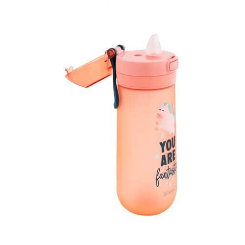 Botella con asa de silicona y capacidad de 650 ml, realizada en plástico libre de BPA y de ftalatos. Cuenta con un cierre de seguridad y con un botón que evita que la botella se abra en la mochila y facilita su uso a los más pequeños.