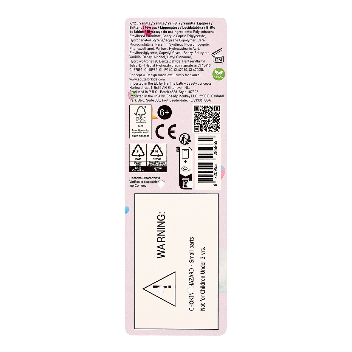 Brillo de labios espiral Unicornio de Souza es un maquillaje infantil con diseño llamativo en espiral que combina tonos rosa, naranja y amarillo con efecto brillante.
