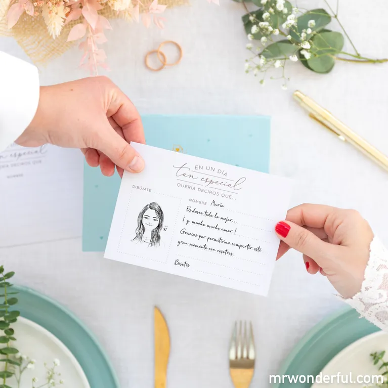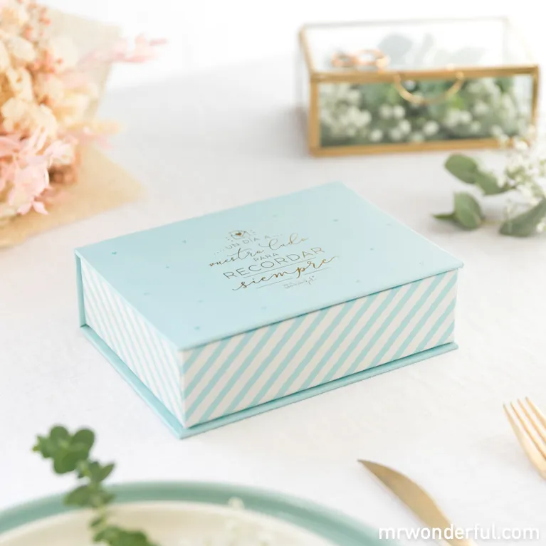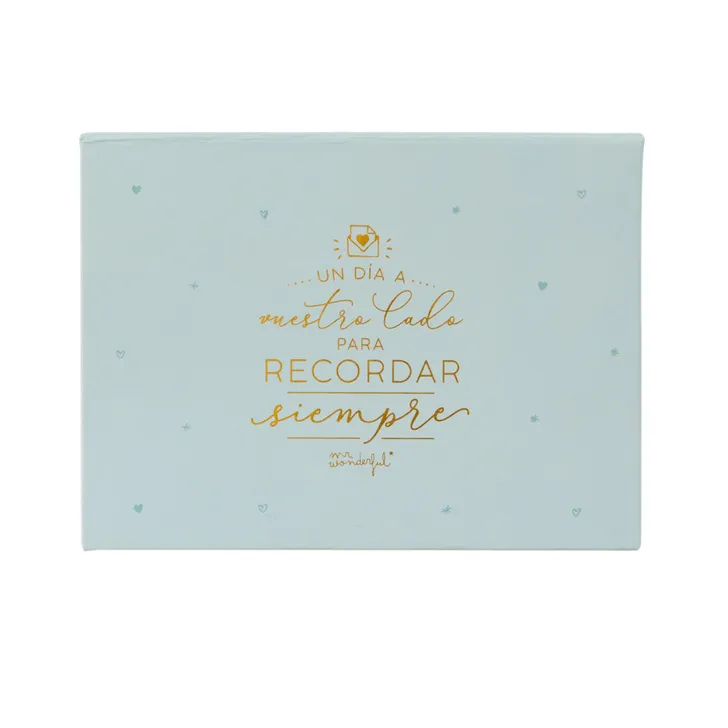– Cajita de cartón rígido y forrado, con mensaje exterior y 100 tarjetas en su interior, cada una de ellas pautada para ayudar a los invitados a una boda a dejar un mensaje a los novios.
