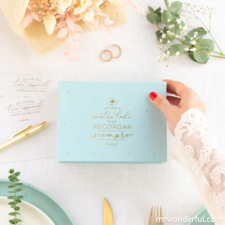 ¿Lo tenéis ya todo listo para el gran día? Ojo no acelerarse con la respuesta. Porque aunque estamos convencidos de que os lo estáis currando de lo lindo con la organización, siempre queda algún detallito suelto (es así). Pero, no os preocupéis, que para ayudaros a tenerlo todo controlado para la boda está Mr. Wonderful. Porque pocas cosas nos gustan tanto como un sarao con buena comida, música, bailoteo y gente bonita. Y para que podáis recordarlo y, sobre todo, dar la oportunidad a vuestros invitados de dejaros una bonita dedicatoria el día de la boda, traemos una estupenda novedad en nuestra colección de regalos de boda. Sí, nos referimos a esta bonita caja que incluye 100 tarjetones para dedicatorias tan únicas como vuestros invitados. La cajita es de cartón rígido y forrado y cuenta con un llamativo mensaje exterior. Las tarjetas están pautadas para ayudar a los invitados a la boda a dejar un mensaje inolvidable a los novios. Una estupenda y original alternativa al libro de firmas que gracias a su formato resulta más práctico y emotivo de conservar. Sin duda, una buena opción como regalo de boda o un accesorio irresistible al que los novios solo podrán decir: sí, queremos.