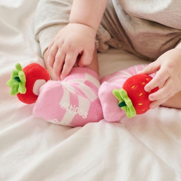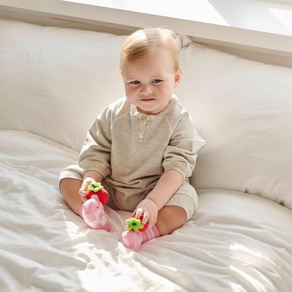 Calcetines blanditos con texturas, colores contrastantes y sonajero suave en forma de fresa para estimular los sentidos del bebé.