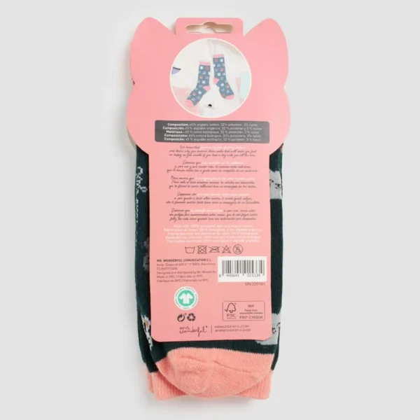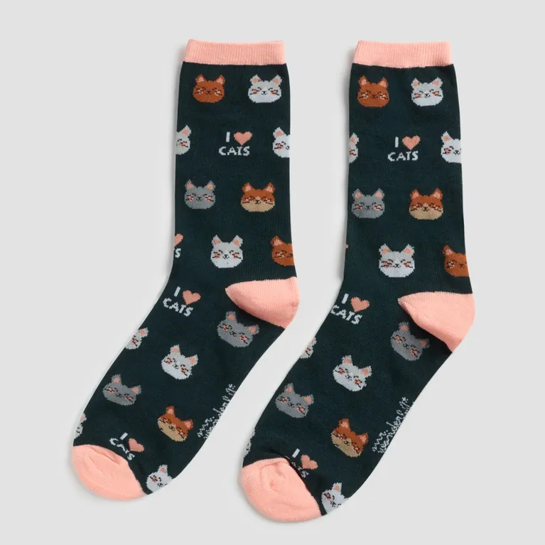 Calcetines con estampado de caras de gatitos, disponibles para las tallas 35-38, 39-41 y 42-46. Realizados con algodón orgánico y tintes ecológicos.