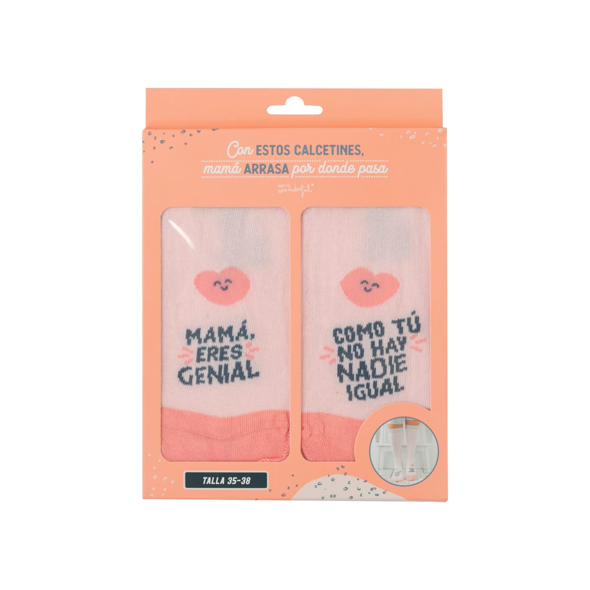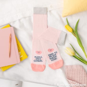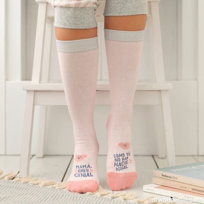 Calcetines con mensaje para madres, realizados en algodón, nailon y poliéster. Disponibles en dos tallas distintas: 35-38 y 39-42