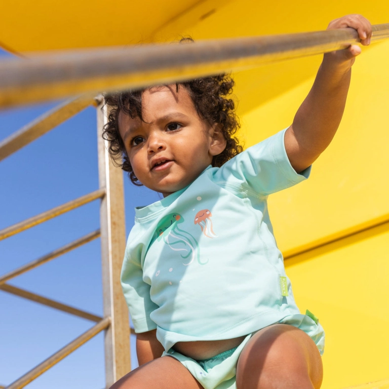 La camiseta con protección solar modelo Jellyfish de Saro es la aliada perfecta para los días de playa, piscina o cualquier actividad al aire libre. Su tejido con protección UV UPF 50+ bloquea eficazmente los rayos del sol, cuidando la piel delicada de los bebés y niños pequeños.