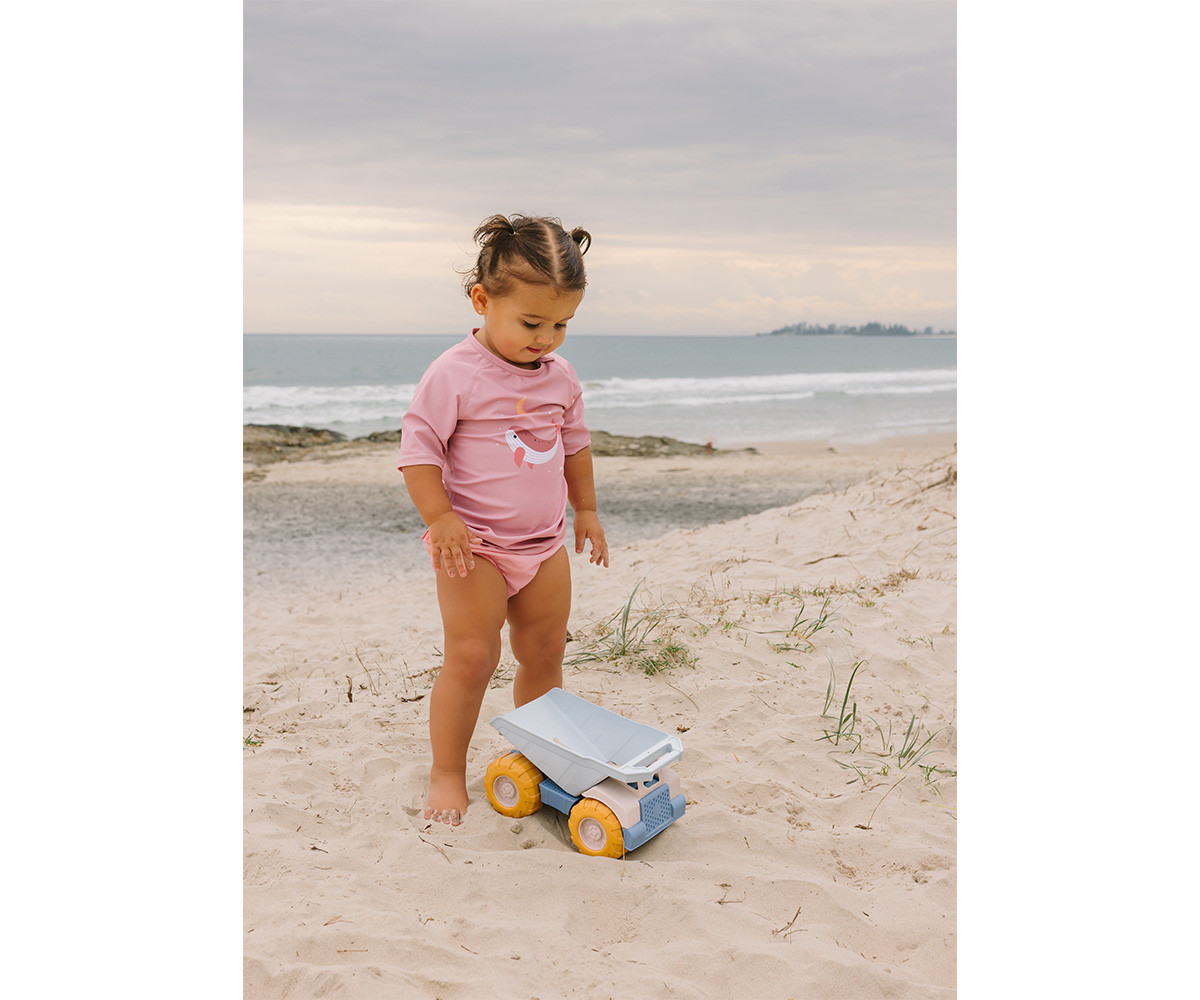 Camiseta de Protección Solar Whale Pink Monnëka ligera, cómoda y perfecta para proteger a los peques del sol en la playa o piscina.