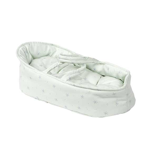 Bonito capazo para muñecas de 36 cm de color verde con estampado de estrellitas. ¡Los peques podrán llevar a sus muñecas a todas partes!