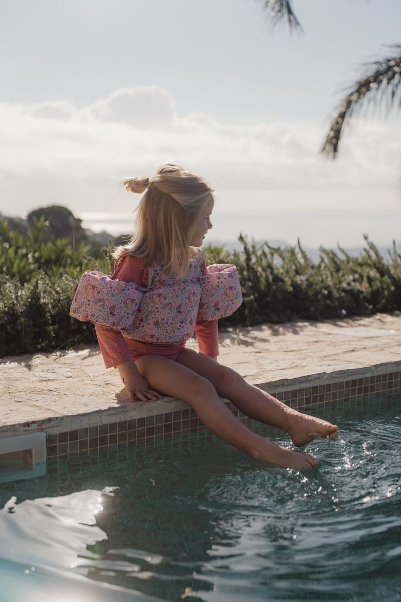 El chaleco flotador con manguitos Sirenas ofrece una protección extra gracias a sus manguitos incorporados, proporcionando mayor equilibrio y confianza en el agua. Su diseño en tonos suaves con estampado de sirenas y flores lo convierte en una opción tan bonita como funcional.
