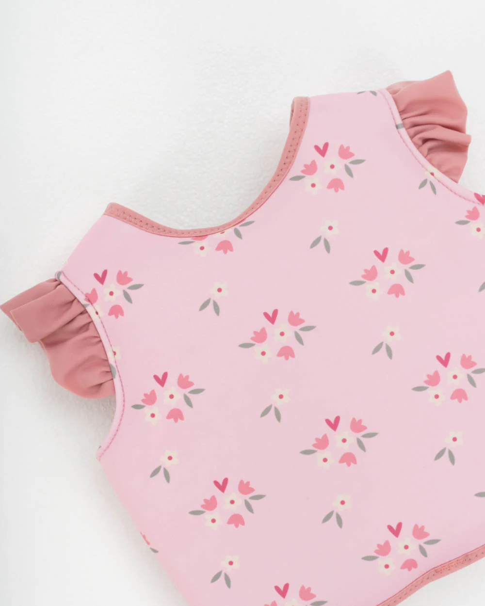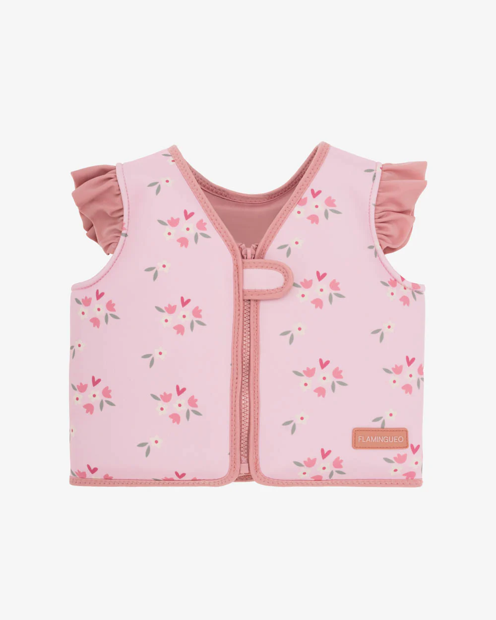 El chaleco flotador infantil Valley es ideal para acompañar a los pequeños en sus primeros pasos en el agua. Su diseño en color rosa con delicados estampados florales y volantes en los hombros lo hace especialmente bonito.