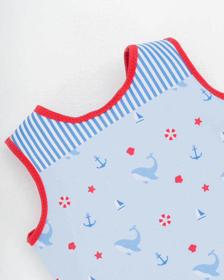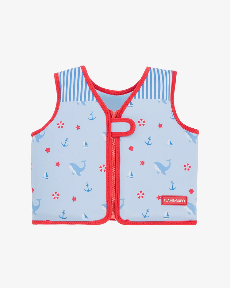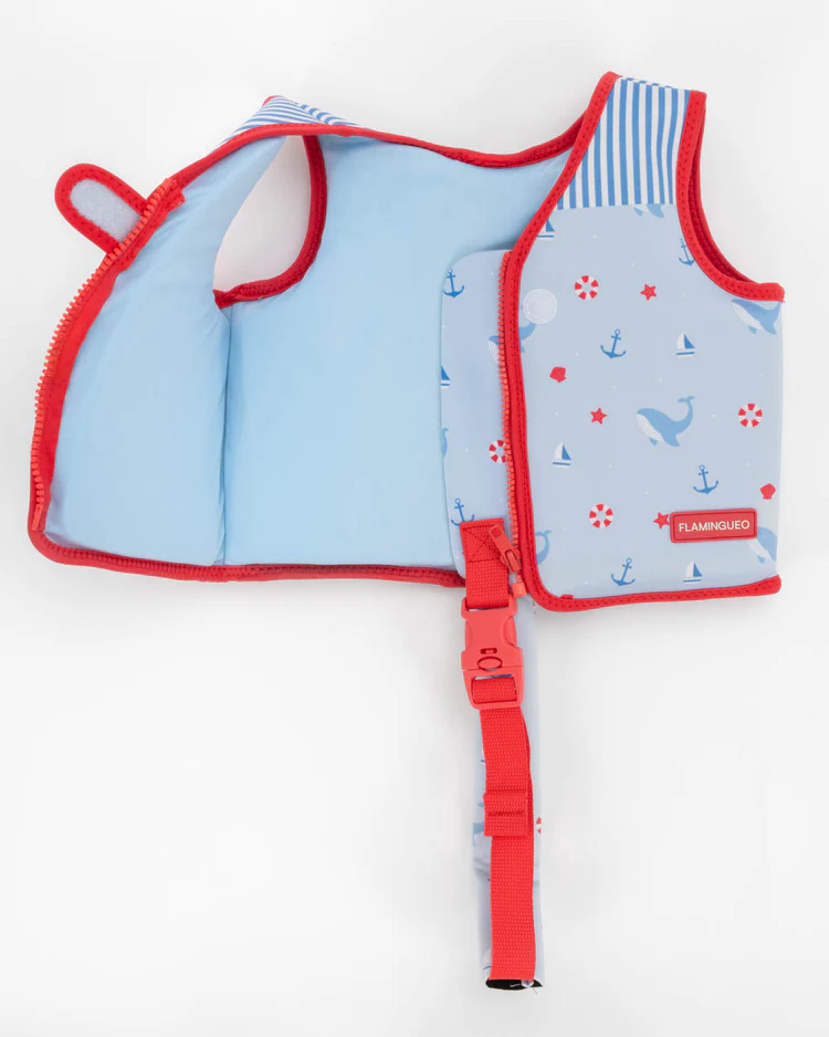 El chaleco Dolphin combina diseño y funcionalidad con un estilo en tonos azules decorado con motivos marinos como ballenas, anclas y barcos, perfecto para los pequeños amantes del mar.
