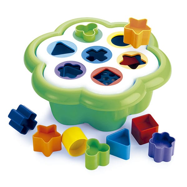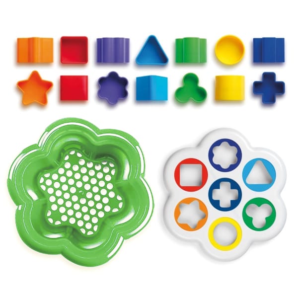 – Incluye 14 piezas: 2 triángulos azul cielo, 2 flores lilas, 3 cuadrados rojos, 2 estrellas naranjas, 2 tréboles verdes, 2 cilindros amarillos, 2 cruces azul marino, 1 base en forma de margarita con 7 agujeros y 1 cubo.