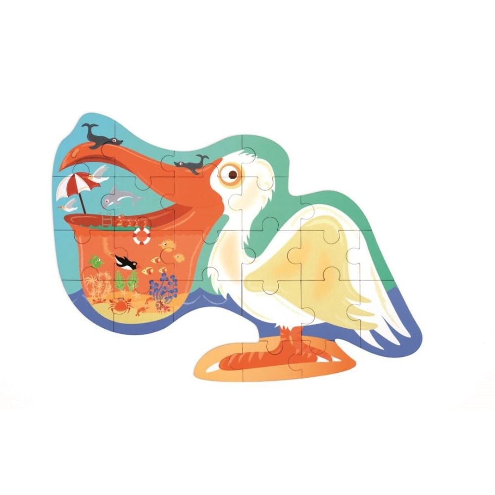 Diviértete con tu hijo/a y ejercita y desarrolla al mismo tiempo la memorización y la capacidad de construcción. Puzzle de cartón de 24 piezas con la imagen de un pelícano.