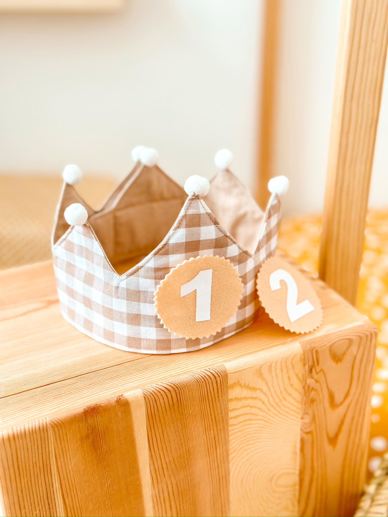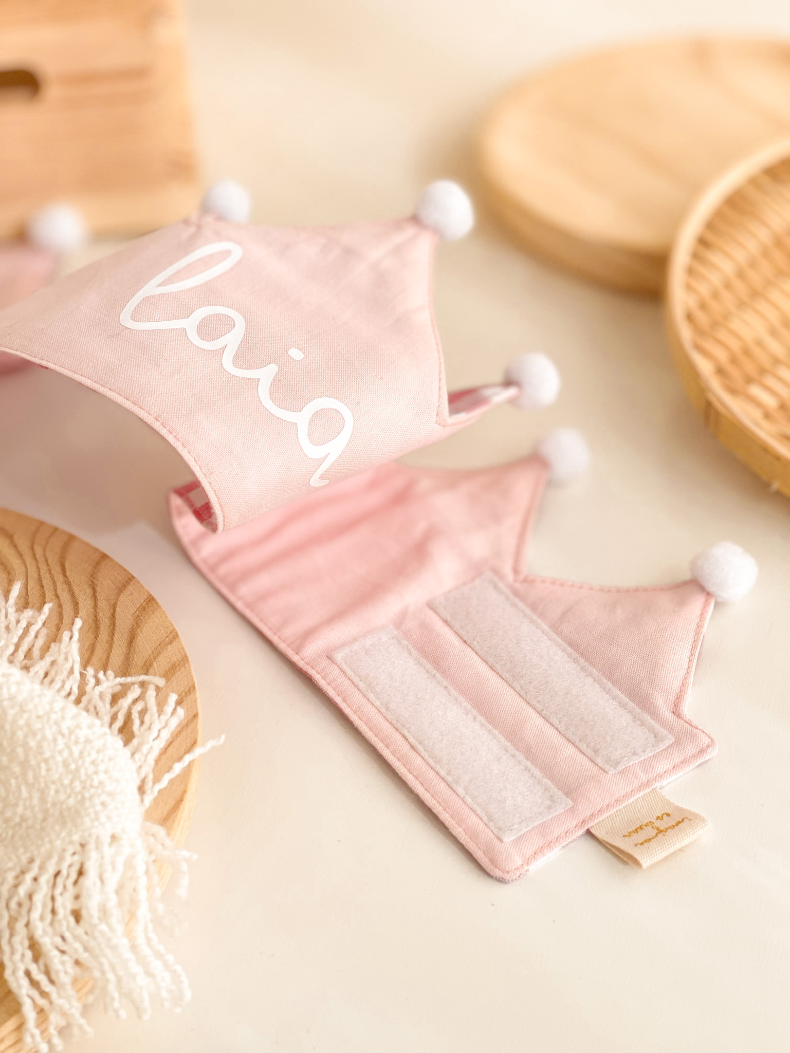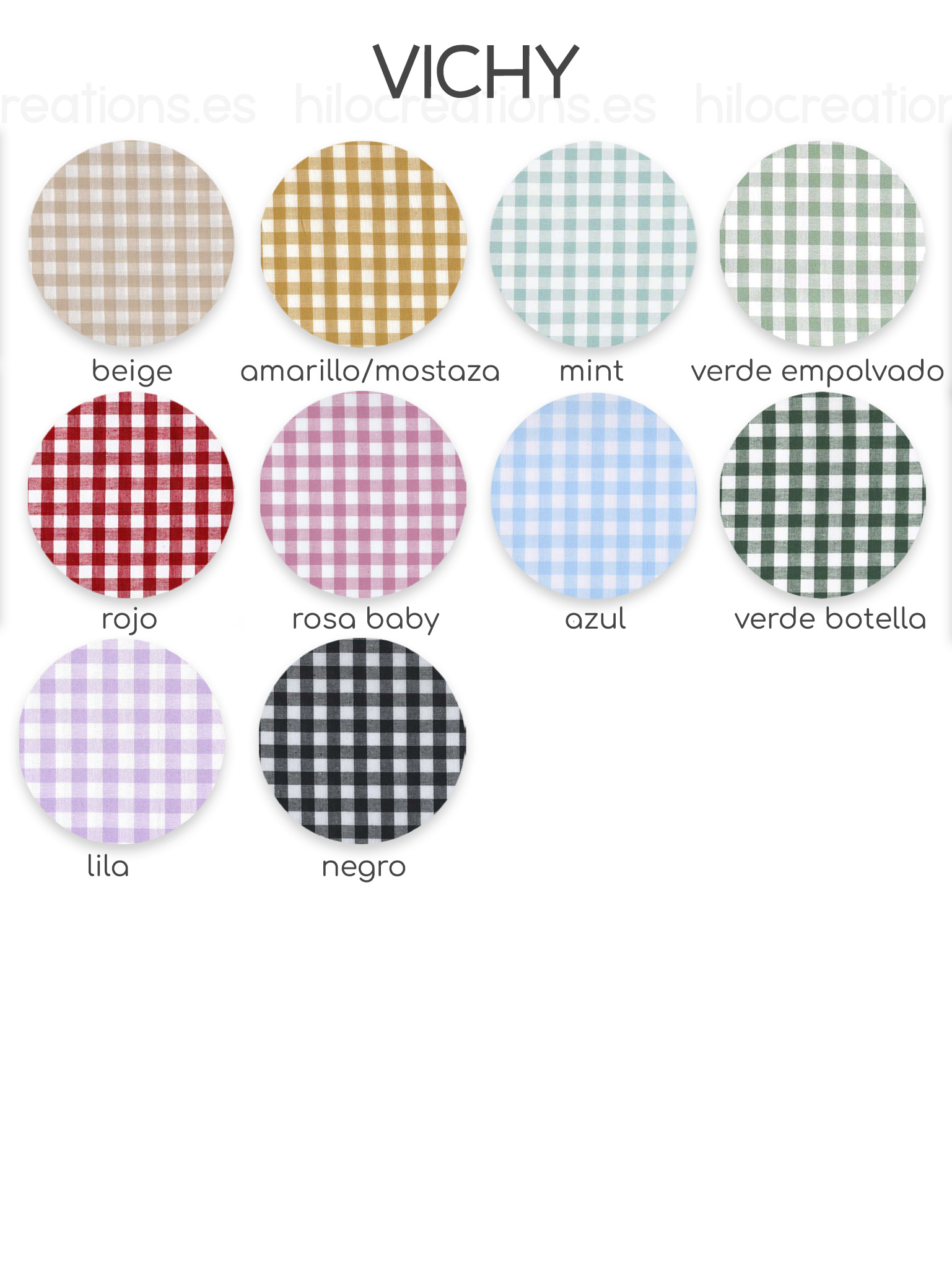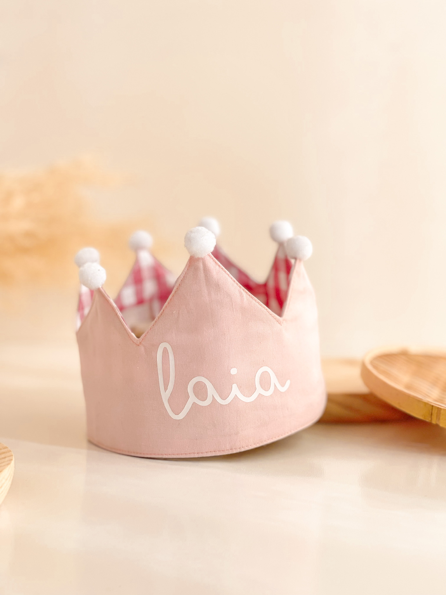 Corona hecha 100% a mano en el taller de Hilocreations con tela de algodón orgánico. Con estampado Vichy y disponible en varios colores diferentes.