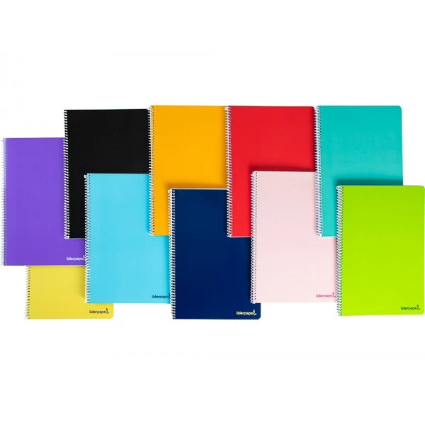 Tapa de cartoncillo impresa y plastificada en polipropileno brillo. Contratapa de cartoncillo. Papel de 60 g/m². Espiral nylonizada. Con margen. 10 colores. Coil-lock.