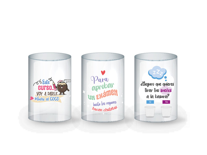 Cubilete transparente frases con brillantina surtidas