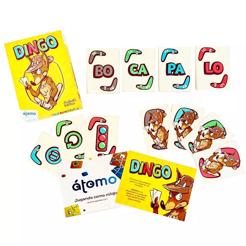 DINGO es un divertido y sencillo de atención visual y rapidez. El juego que contiene 55 cartas con sílabas y diferentes acciones.