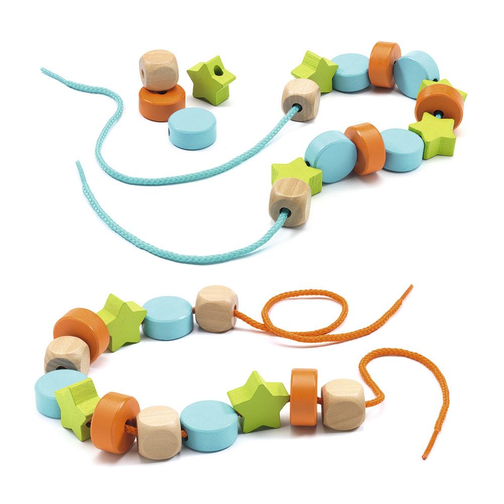 Jugar y combinar estas coloridas piezas de madera realizando infinitas creaciones será divertidísimo. ¿Un collar?, ¿un cinturón?, ¿un decorativo cordón? Solo hay que imaginar y enhebrar.