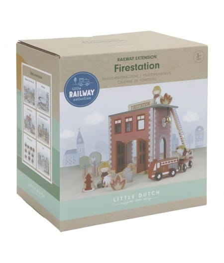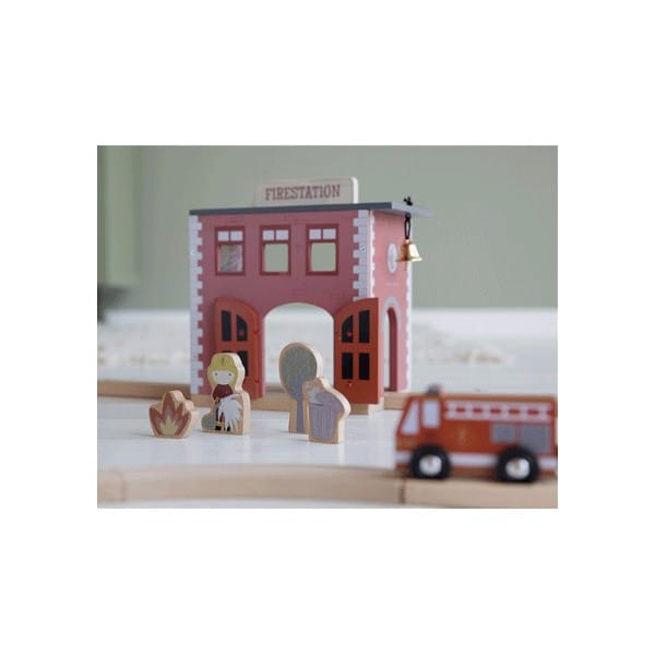 Esta estación de bomberos tiene diferentes figuras de madera con ilustraciones detalladas en ambos lados.