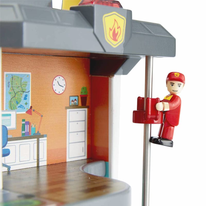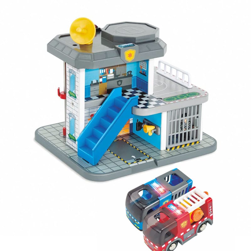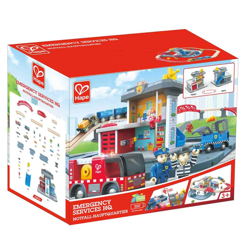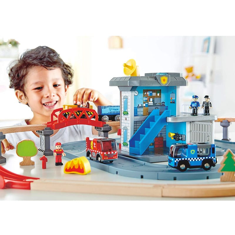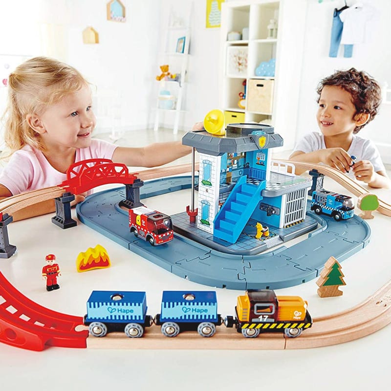 Conjunto de juguetes de la marca Hape que incluye un tren, estación de servicios de emergencia con bomberos y policía. Con varios vehículos diseñados para niños de 3 a 8 años. Los vehículos tienen luces y sonidos que los hacen aún más realistas y emocionantes.