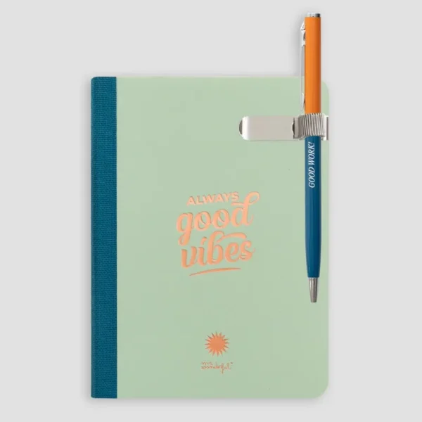 Dentro del estuche encontramos una libreta pequeña con 48 hojas, realizada en papel con certificado FSC, lo que garantiza que ha sido obtenido de bosques gestionados de forma responsable. También encontramos un bolígrafo metálico, con clip y con la tinta de color azul.