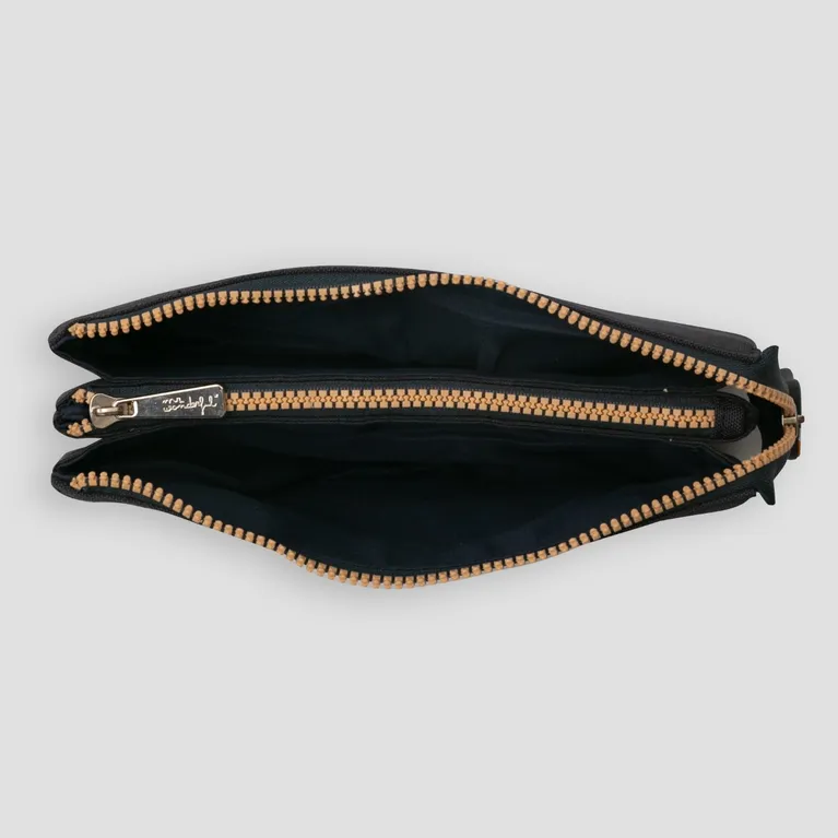 Estuche con tres compartimentos individuales y cierre de cremallera. Está realizado en rPET, un material 100 % reciclable, obtenido a partir del reciclaje de botellas de plástico.