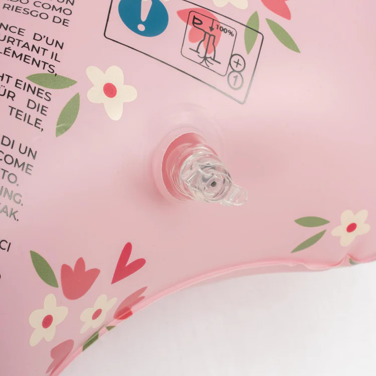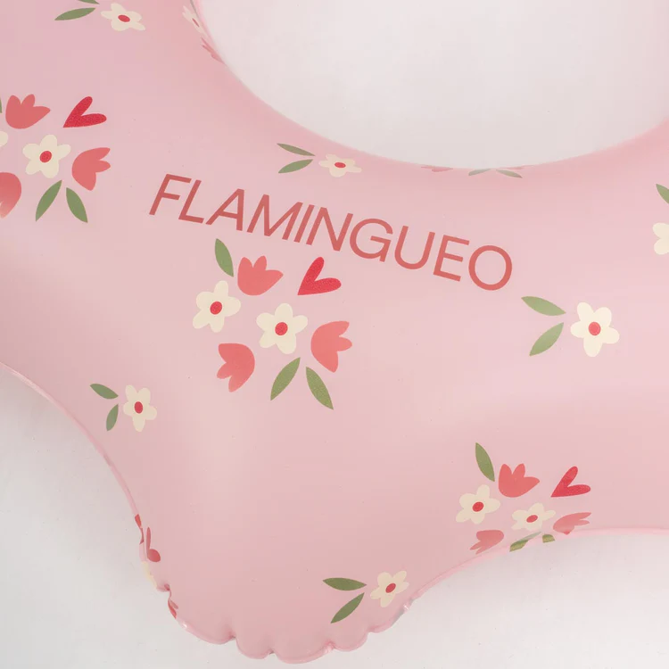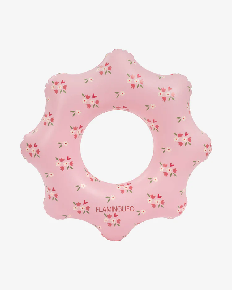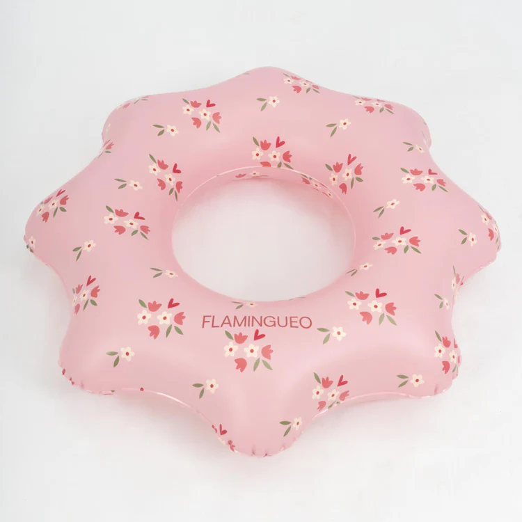 El flotador donut Wavy destaca por su original forma ondulada y su bonito diseño en color rosa con pequeños detalles florales, perfecto para los días de verano.