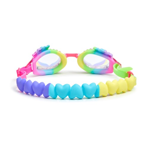 Las gafas de natación Luvs Me Luvs Me Not Cotton Candy de Bling2o destacan por su diseño lleno de color con tonos pastel y detalles de corazones tanto en las lentes como en la cinta, creando un estilo dulce y divertido.