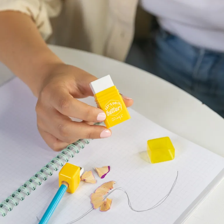 Sacapuntas con depósito y goma de borrar, con mensaje impreso en él. ¡Afila tus habilidades y anímate a volver a intentarlo!