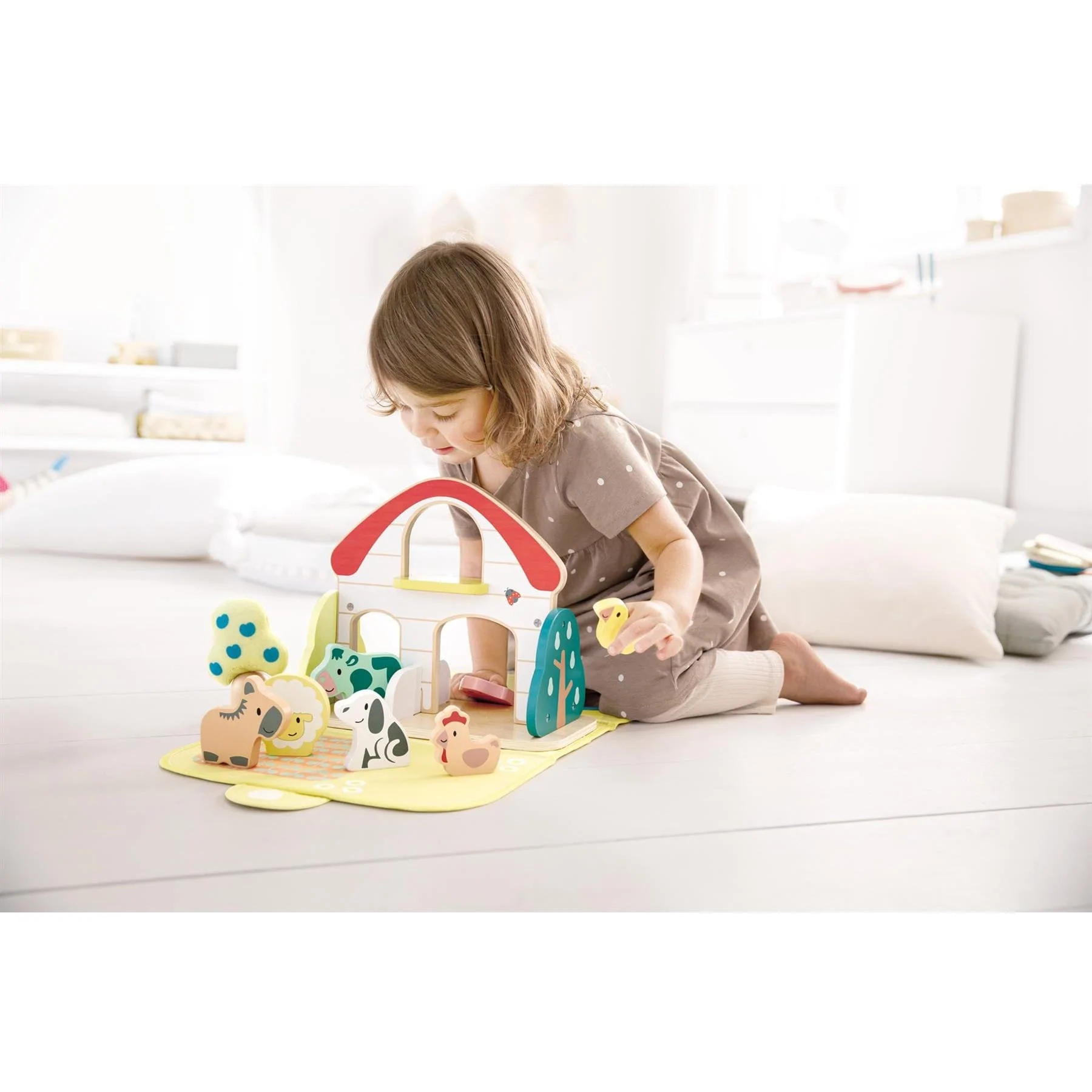 • Incluye 8 animales de granja y accesorios de madera y textil