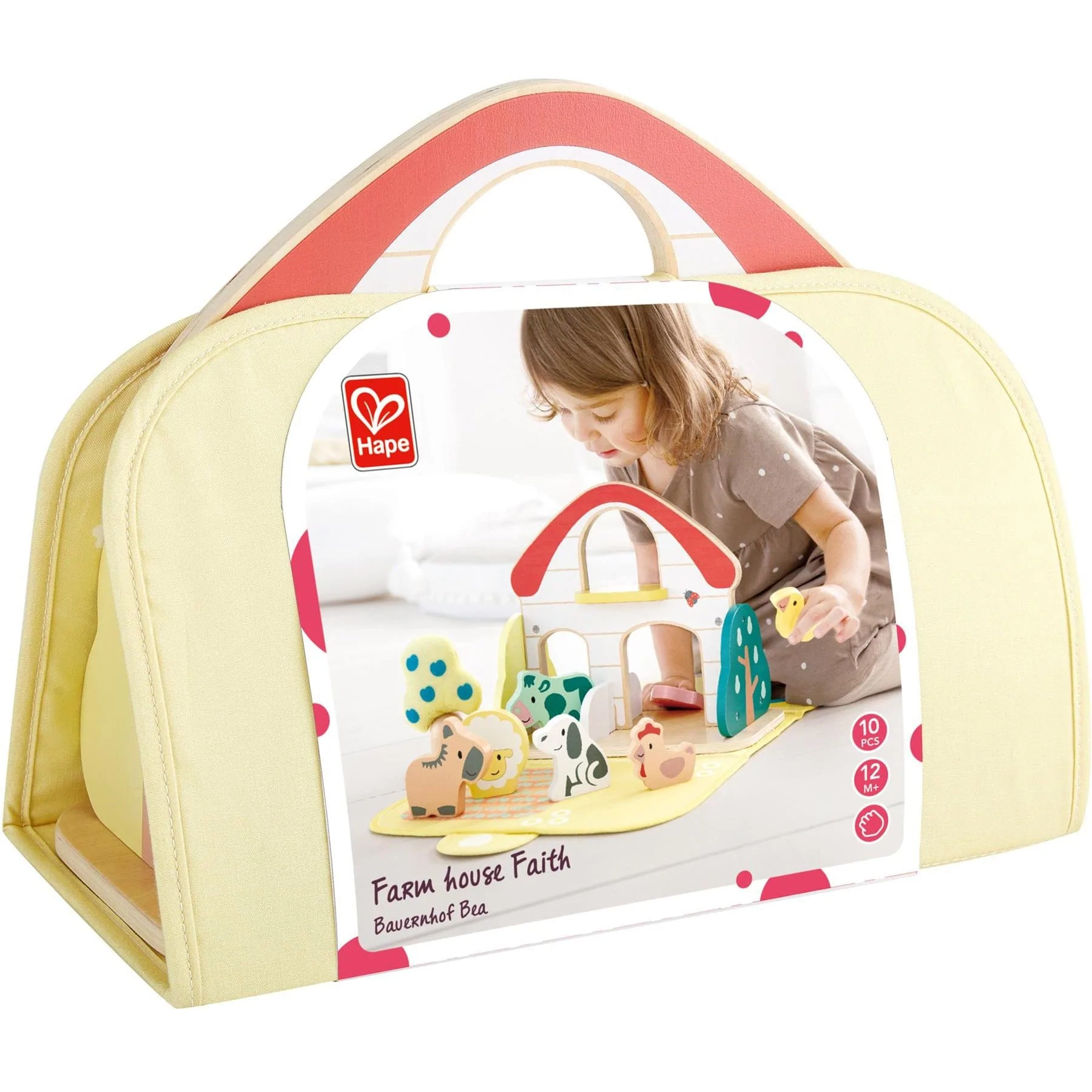 La Granja Hape Faith es el juego perfecto para cualquier pequeño amante de los animales. Se trata de una colorida granja de madera construida sobre una práctica alfombra de juego textil que crea una auténtica experiencia de granja para los niños. El juego portátil consta de ocho animales de granja y otros accesorios de madera y tela. Gracias al asa de transporte de madera integrada, el juego puede llevarse fácilmente a cualquier parte.