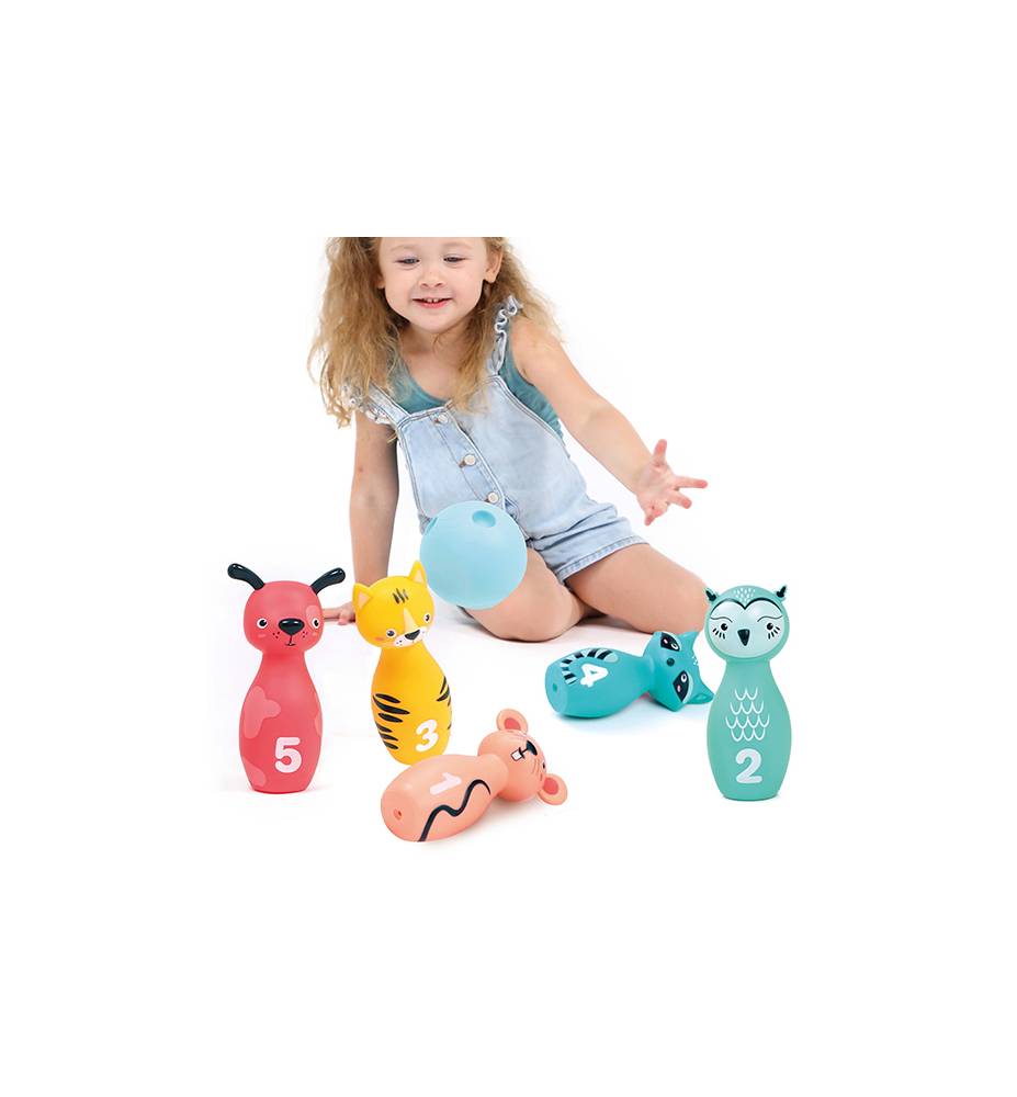 Los colores brillantes y los diseños de animales en los bolos fomentan el reconocimiento visual y la familiaridad con los animales. ¡La pelota está diseñada con un agarre ergonómico de tres dedos para que incluso los más pequeños puedan jugar como un profesional!