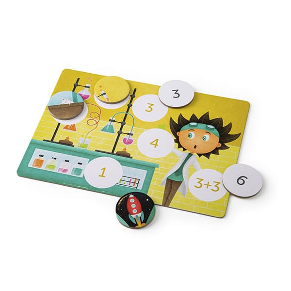 Este juego es perfecto para que los pequeños empiecen a introducirse al mundo de los números de una forma dinámica y divertida. Cada jugador tendrá una ilustración que deberá completar con las fichas que salgan del dispensador. Ojo, que deberán ser rápidos para que otro jugador no les coja la ficha. El objetivo será completar cada uno su tablero con el número correcto que complete la operación.