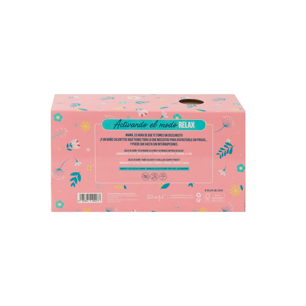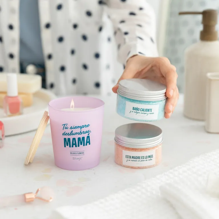 Kit de relax pensado para madres, compuesto por dos tarros de sales de baño y una vela aromática realizada en cera vegetal. Tanto los tarros de sales como la vela tienen un mensaje exclusivo y dirigido para las madres.