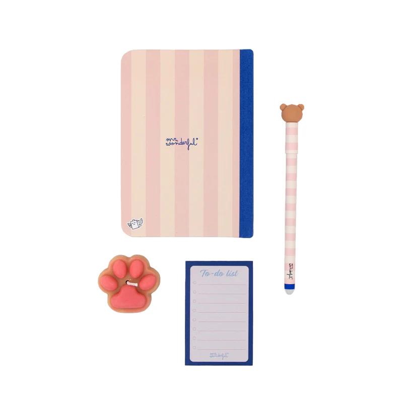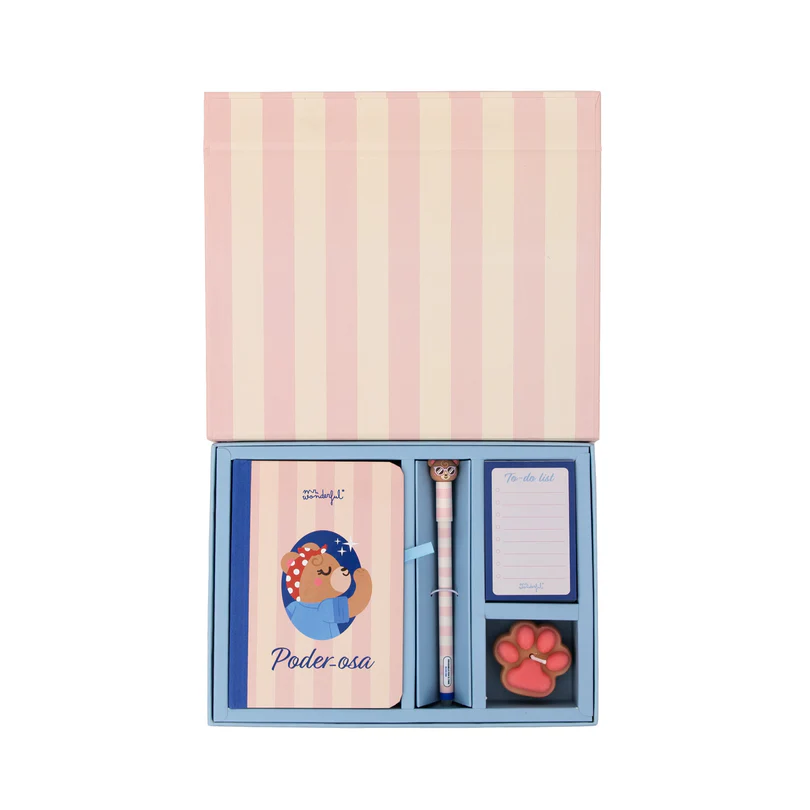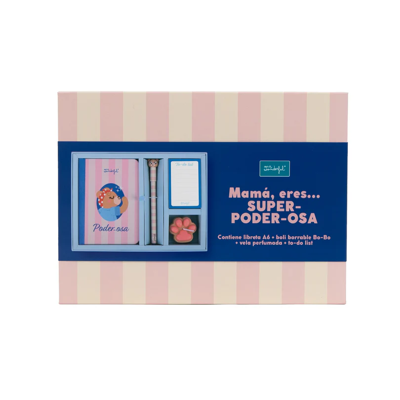 El kit Poder-osa de Mr Wonderful es un regalo perfecto para mamás que lo dan todo cada día. Incluye una libreta A6 con diseño de rayas y personaje ilustrado, un bolígrafo borrable con detalle de osito, una vela aromática y un práctico bloc de notas tipo to do list.