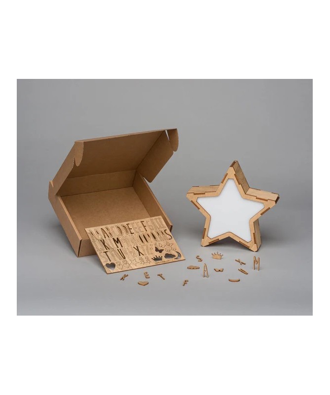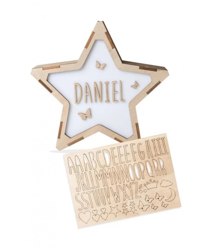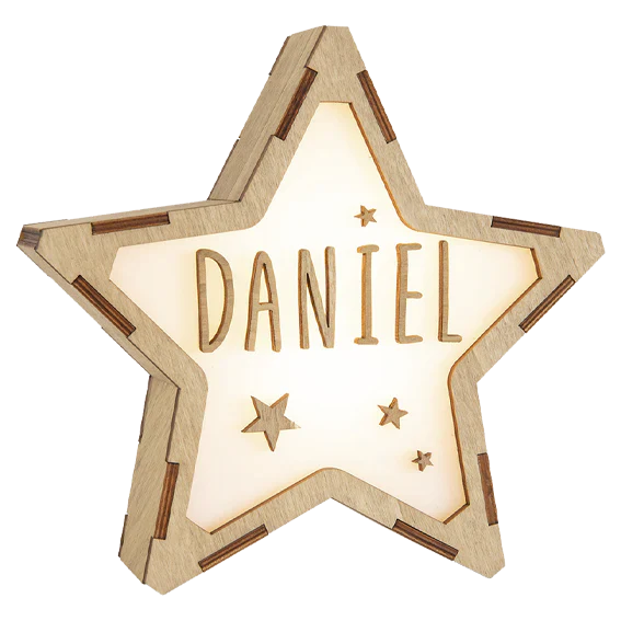 Una lámpara en forma de estrella fabricada a mano en madera sostenible, con iluminación LED cálida y personalizable con el nombre que elijas. Ideal como luz de noche o elemento decorativo único.