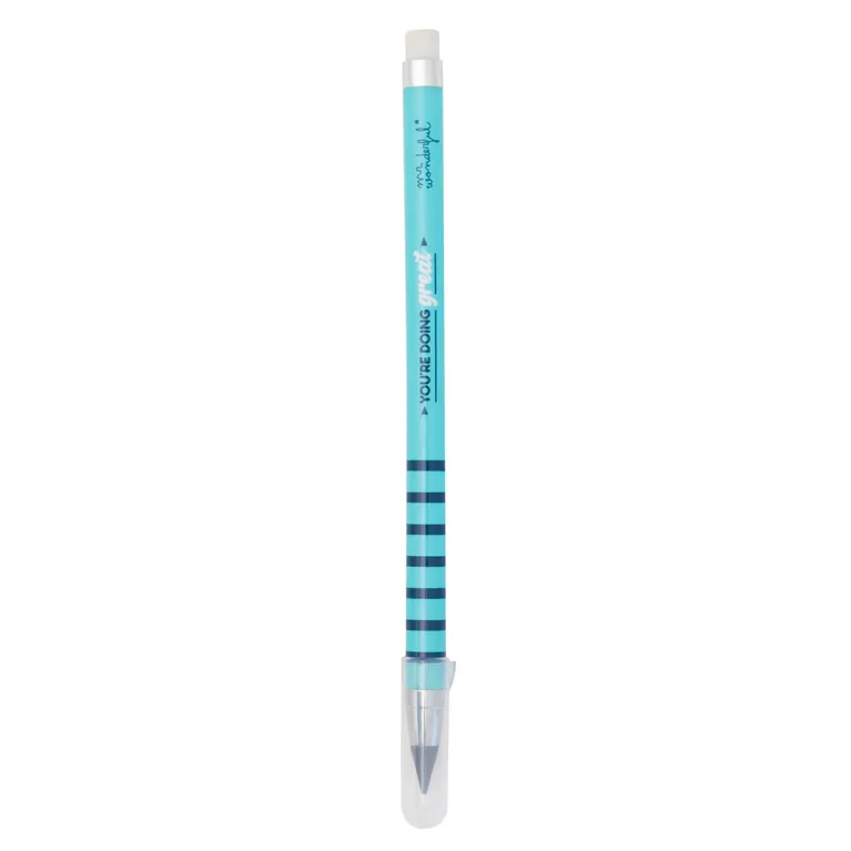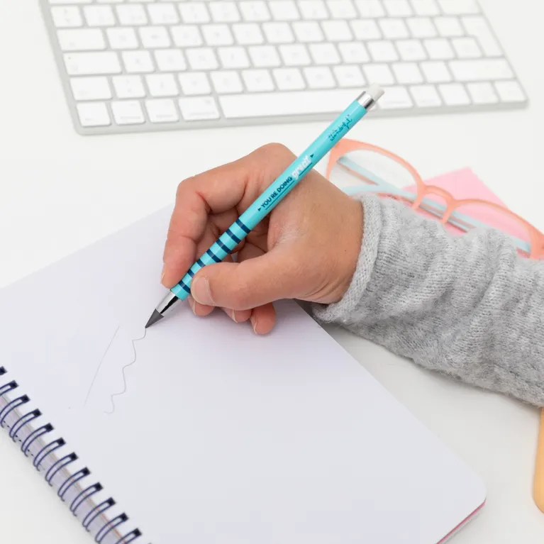 Lápiz infinito con mensaje «You’re doing great!» . Su punta no está fabricada en grafito, sino que se trata de una aleación de estaño y bismuto que logra que no sea necesario afilarla, que no manche, que no se emborrone al escribir y que, a pesar de ello, se pueda borrar con normalidad.
