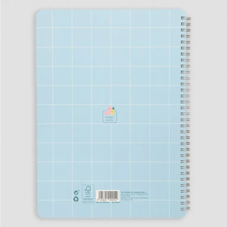Libreta de tamaño A4, con encuadernación en espiral, tapa dura y 80 hojas cuadriculadas de papel de 80 gr en su interior. Además, contiene una hoja con divertidas pegatinas.