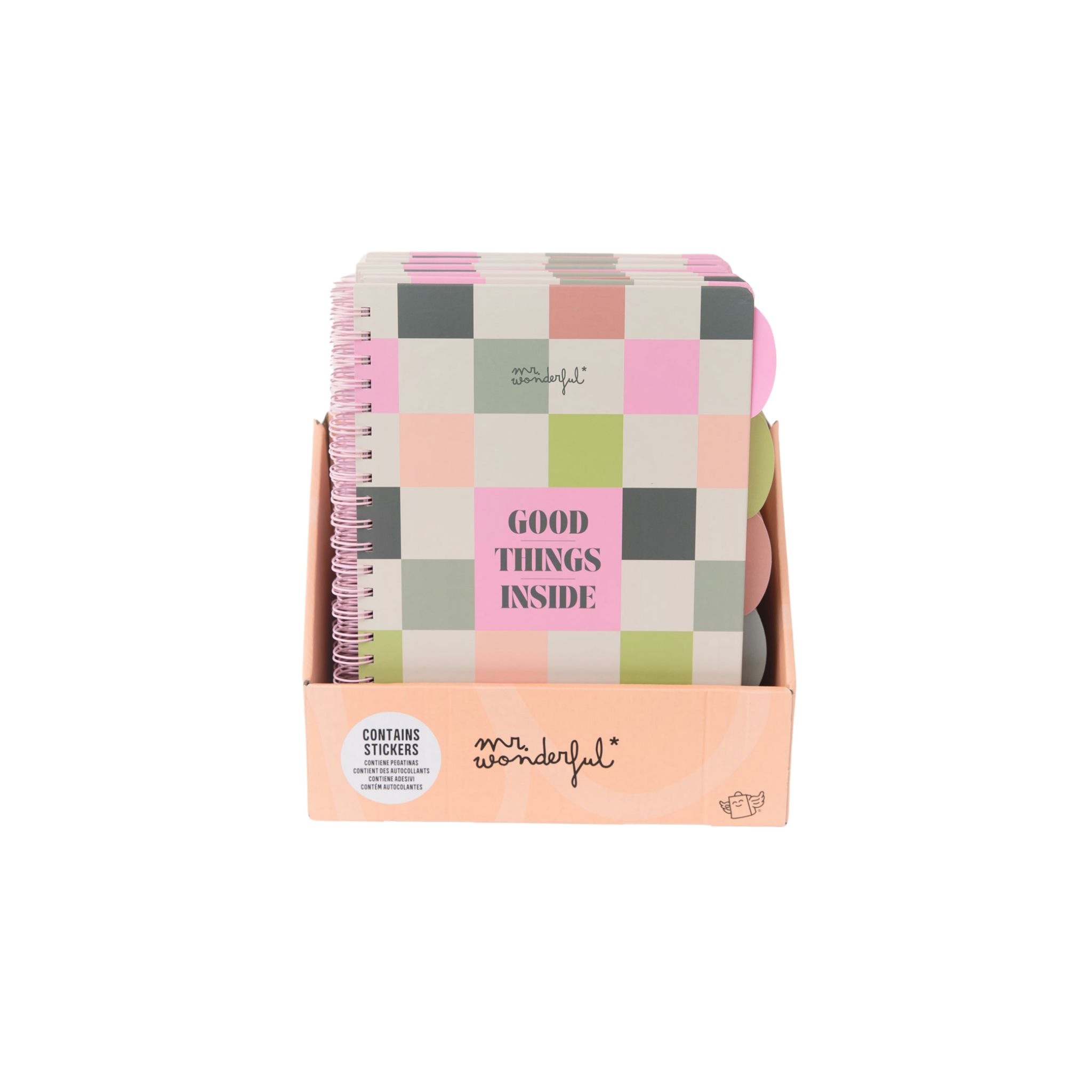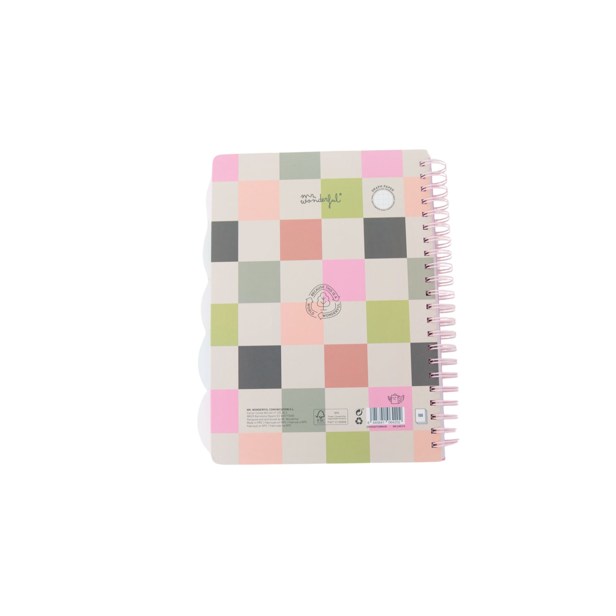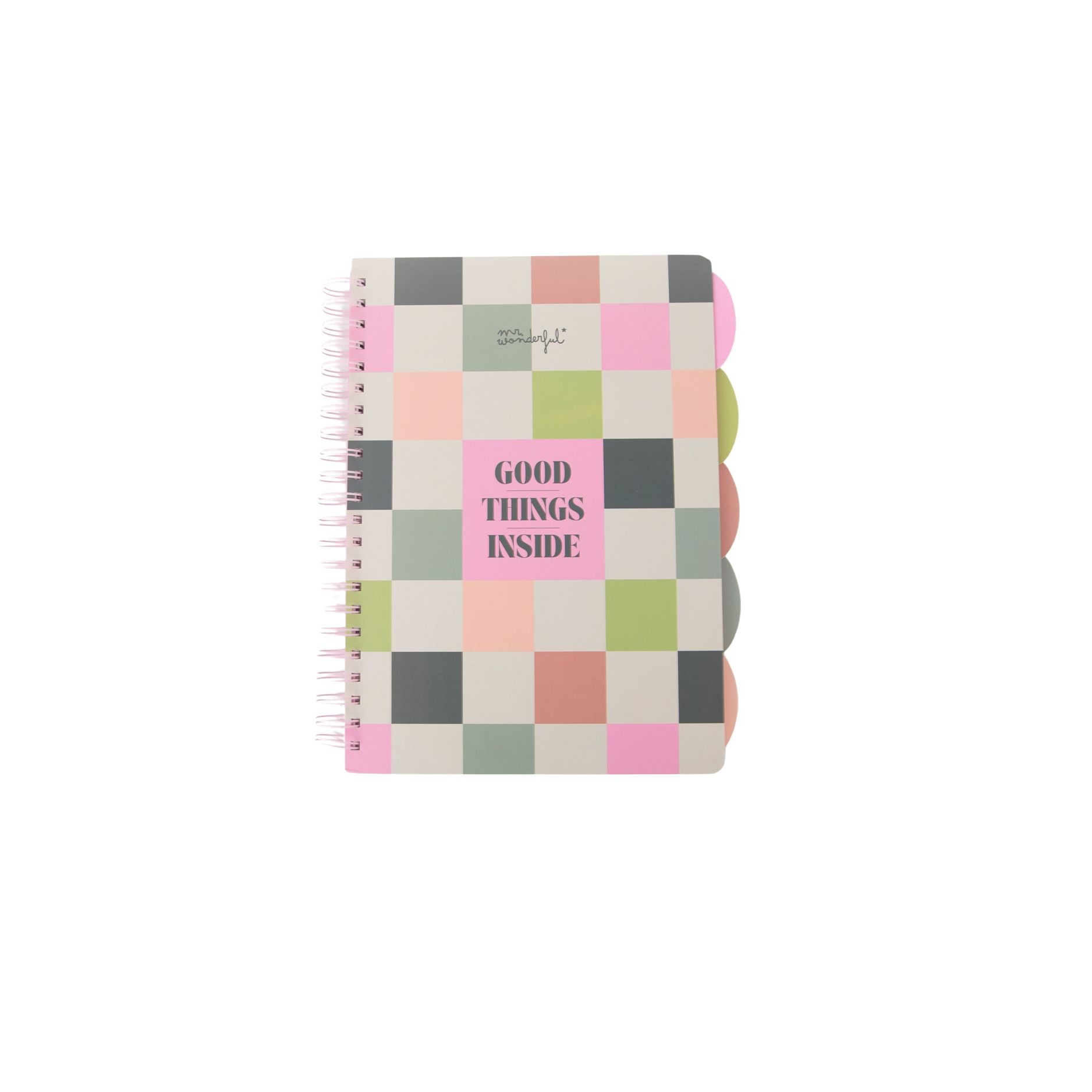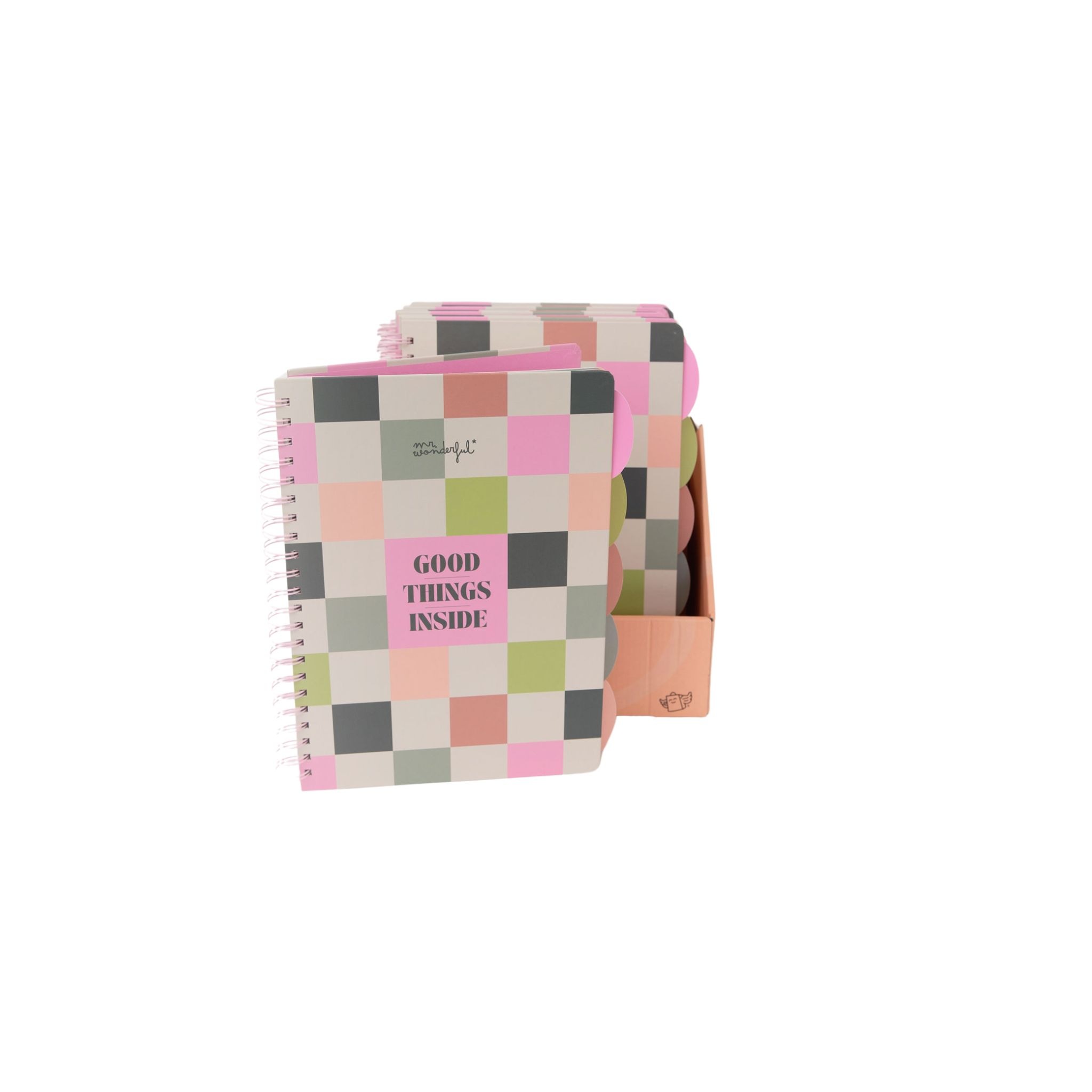 La libreta A4 Good Things Inside de Mr Wonderful es perfecta para quienes buscan un cuaderno amplio, práctico y con diseño inspirador. Su portada de cuadros en tonos suaves y el mensaje positivo la convierten en una opción ideal tanto para estudio como para trabajo.