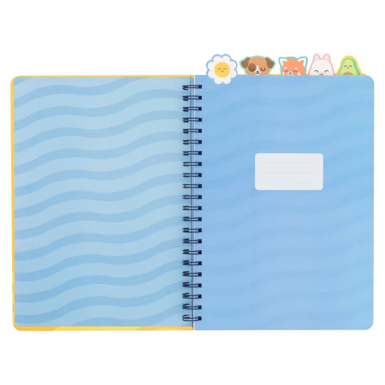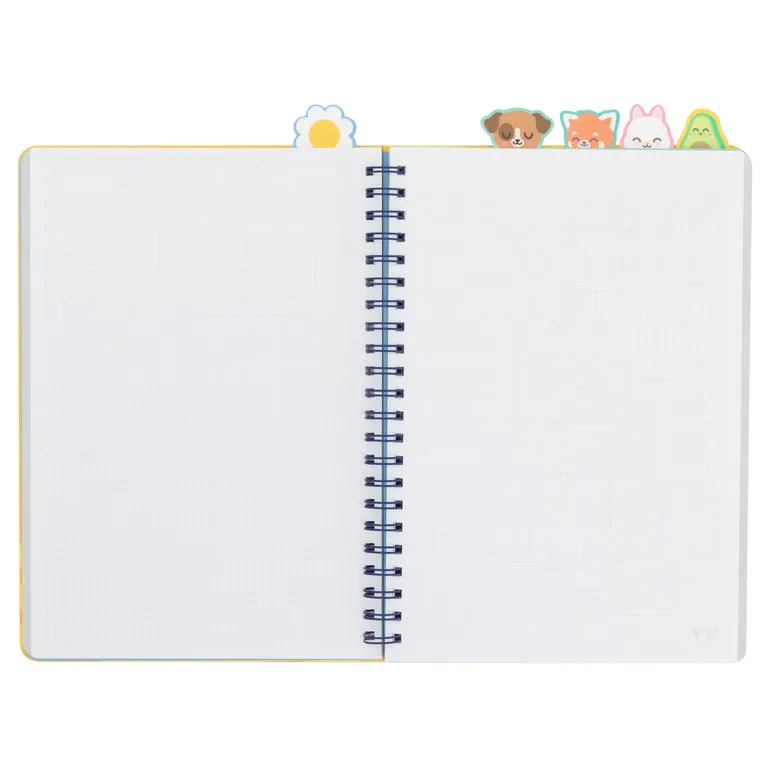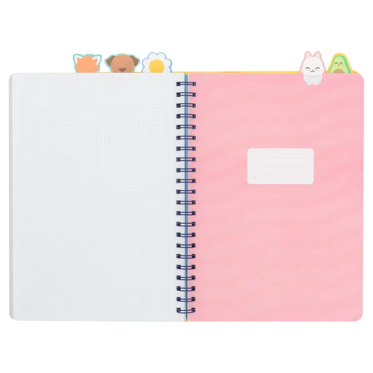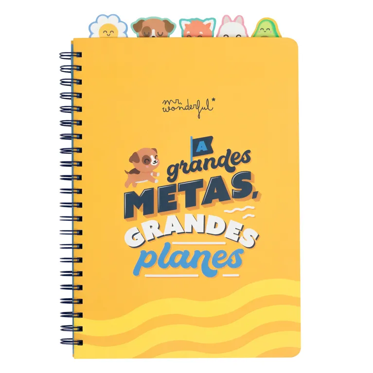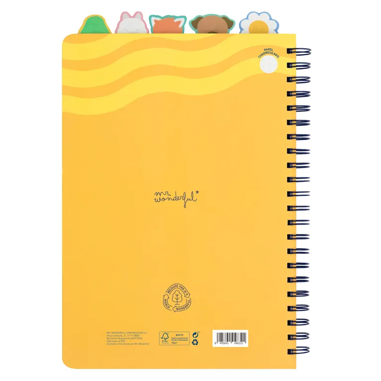 Libreta A4 con interior a cuadros. Cuenta con 5 divisores internos con pestaña, cada uno de ellos con un personaje Mr. Wonderful (margarita, perro, conejo, panda rojo y aguacate), lo que la hace ideal para dividirla por asignaturas o temas. Con 160 páginas.