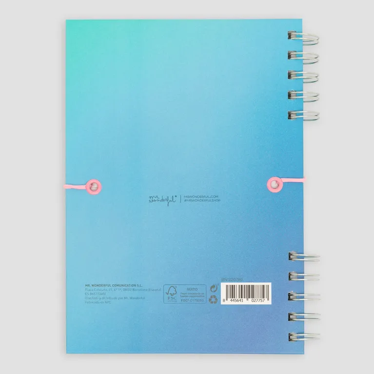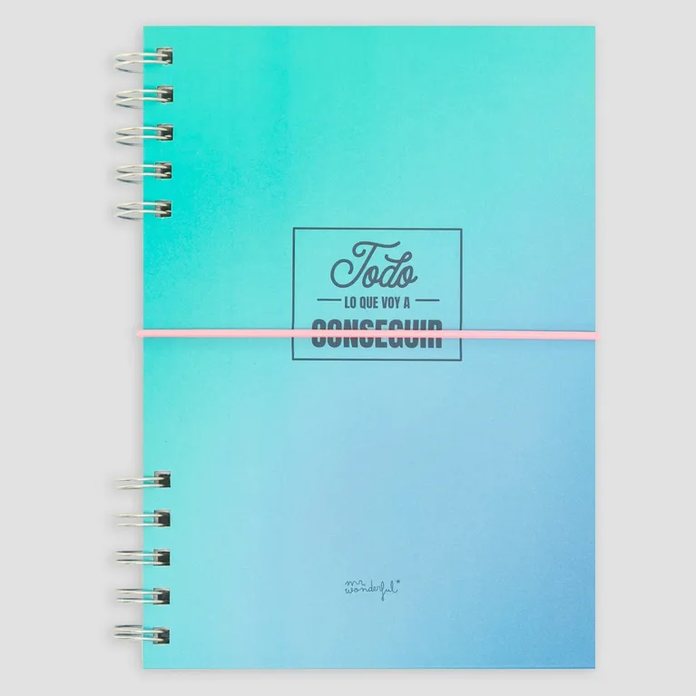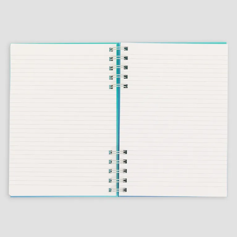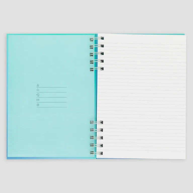 Libreta azul tamaño A5 con encuadernación en espiral. Esta espiral está dividida en dos partes, lo que le aporta originalidad. Cuenta con 80 hojas de papel de 90 gr. con certificado FSC, lo que garantiza que proviene de bosques gestionados de forma responsable. Pautado interior: a rayas. Cada día estás más cerca de conseguir todo lo que te has propuesto. ¡Esta libreta dará fe de ello!