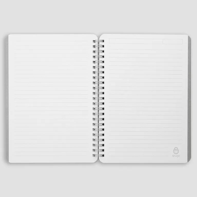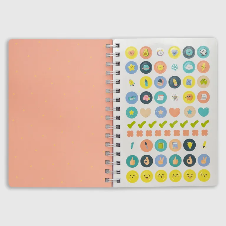 Libreta de tamaño A5, con encuadernación en espiral, tapa dura y 80 hojas a rayas de papel de 80 gr en su interior. Además, contiene una hoja con divertidas pegatinas.
