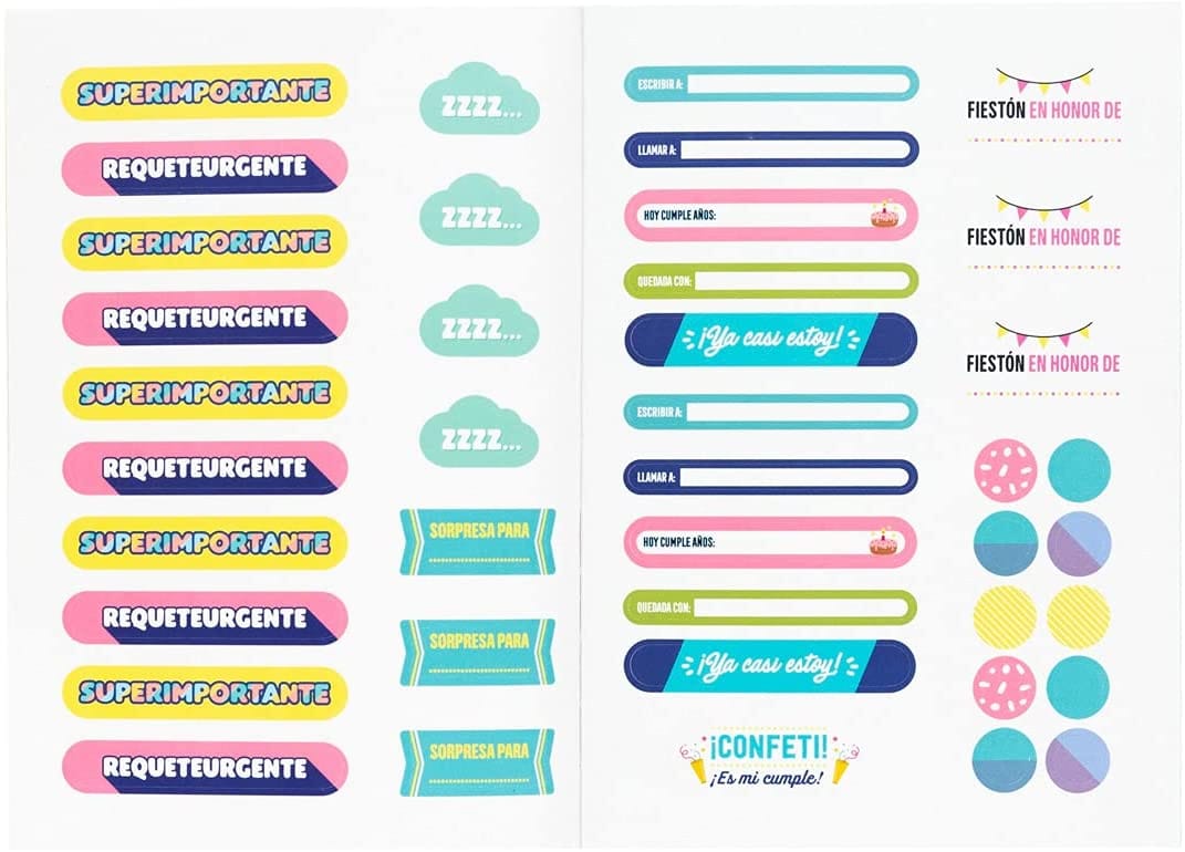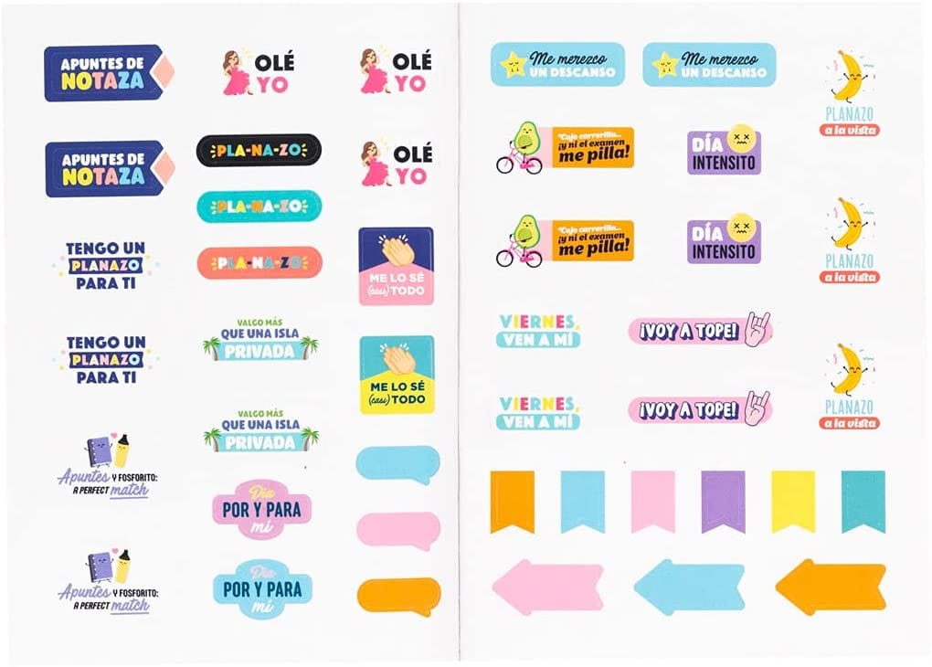Librito con encuadernación cosida que incluye 24 hojas de pegatinas especialmente pensadas para decorar agendas, planificadores, libretas y apuntes.