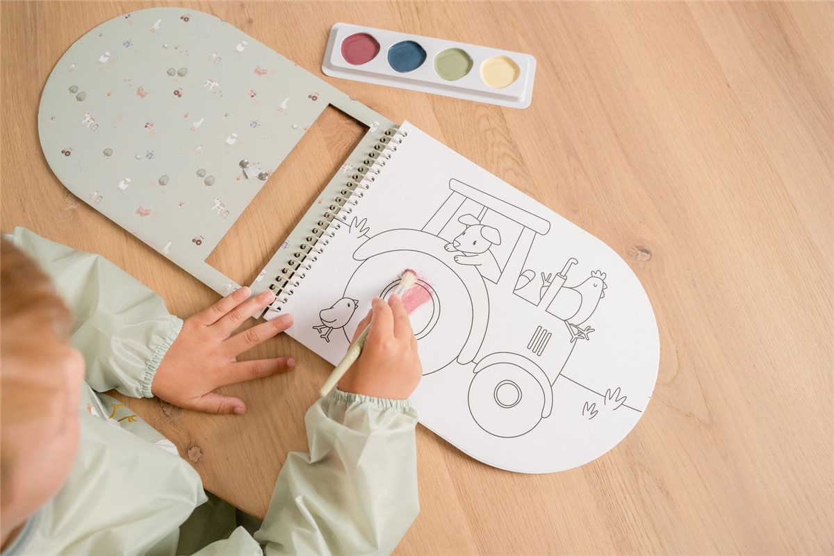 Libro para colorear con acuarelas de temática Little Farm de Little Dutch. Contiene 30 páginas con diferentes diseños para colorear, 4 colores de acuarela y un pincel.