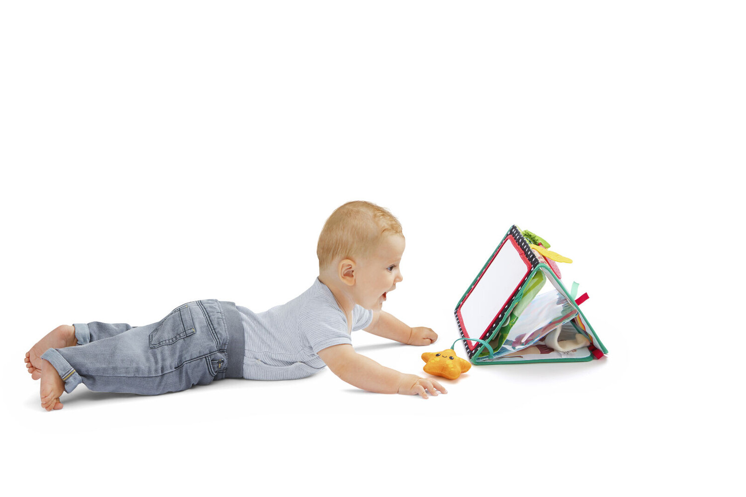 Puede utilizarse en posición caballete para que el bebé observe y manipule los elementos que tiene delante, o completamente desplegado para jugar en el suelo, en el coche o sujeto al parque infantil. Este formato versátil facilita que el bebé descubra nuevas texturas, sonidos y movimientos mientras interactúa con el juguete.