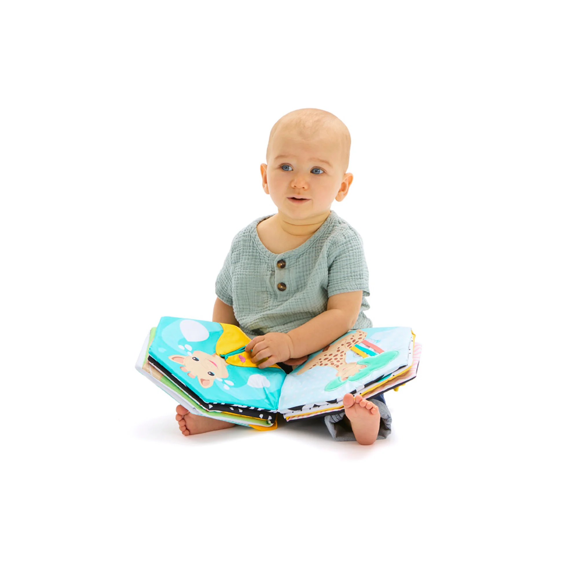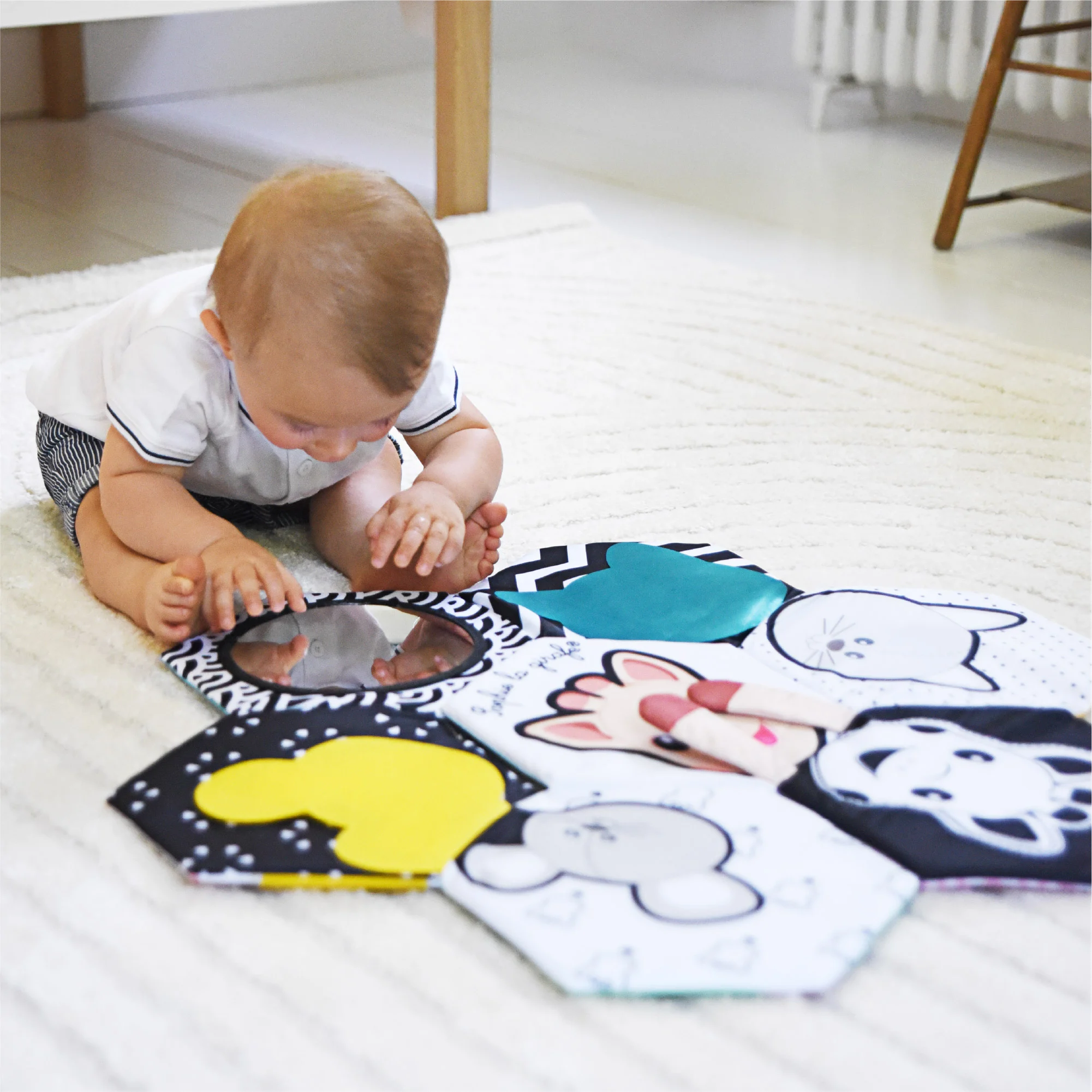 Cuando está plegado funciona como un libro de tela que invita al bebé a descubrir diferentes escenas y actividades. Al abrirlo completamente se transforma en un tapete de actividades de 60 x 60 cm, ideal para jugar en el suelo mientras el bebé desarrolla su curiosidad y sus habilidades motoras.